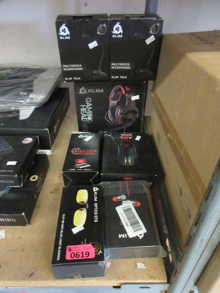 Klim Cool, Klim wired earbuds, Klim computer glasses, Klim Aim RBG wired mouse, Klim gaming headset & 2 Klim multimedia microphones