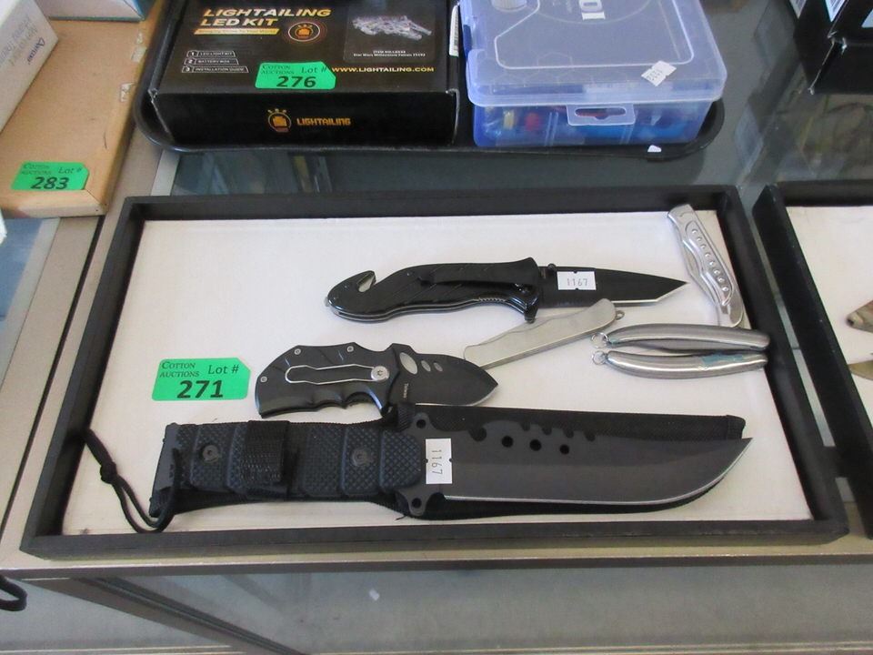Knife with 6" blade, 2 folding knives and 4 pen knives.