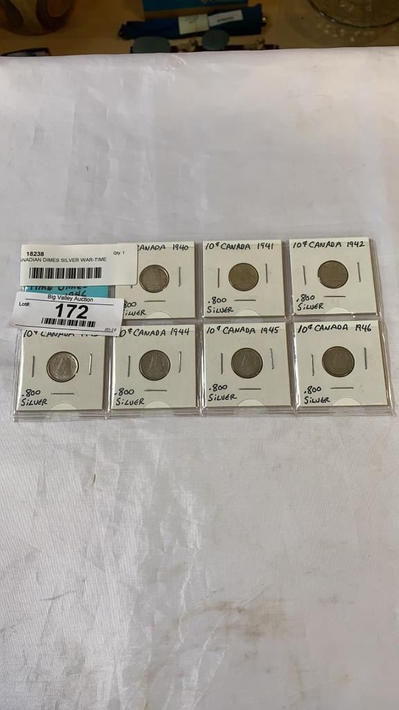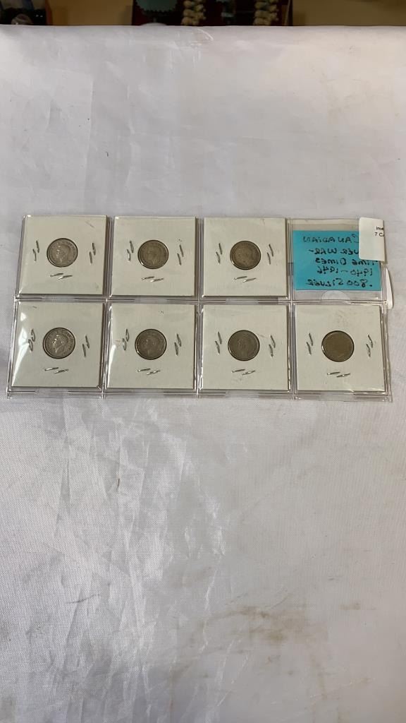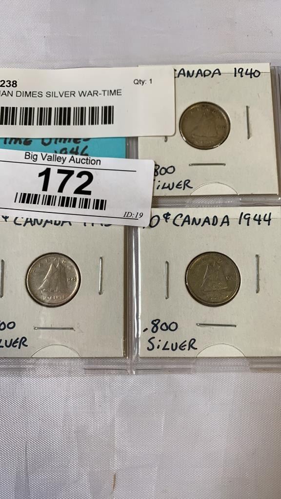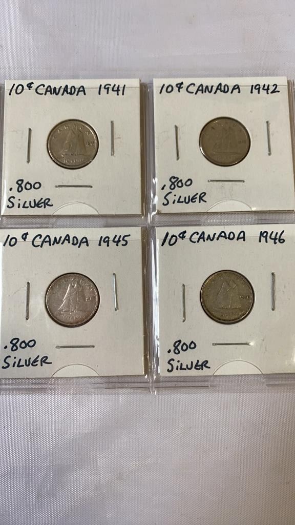 7 CANADIAN DIMES SILVER WAR-TIME DIMES 1940-1946 .800 SILVER
