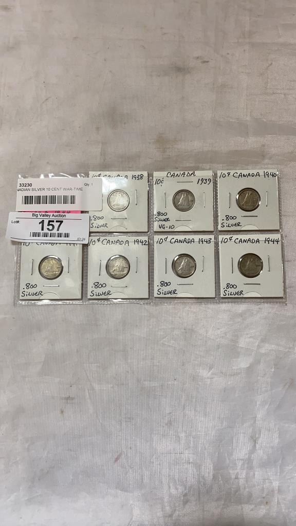 7 CANADIAN SILVER 10 CENT WAR-TIME COINS 1938-1944 .800 SILVER