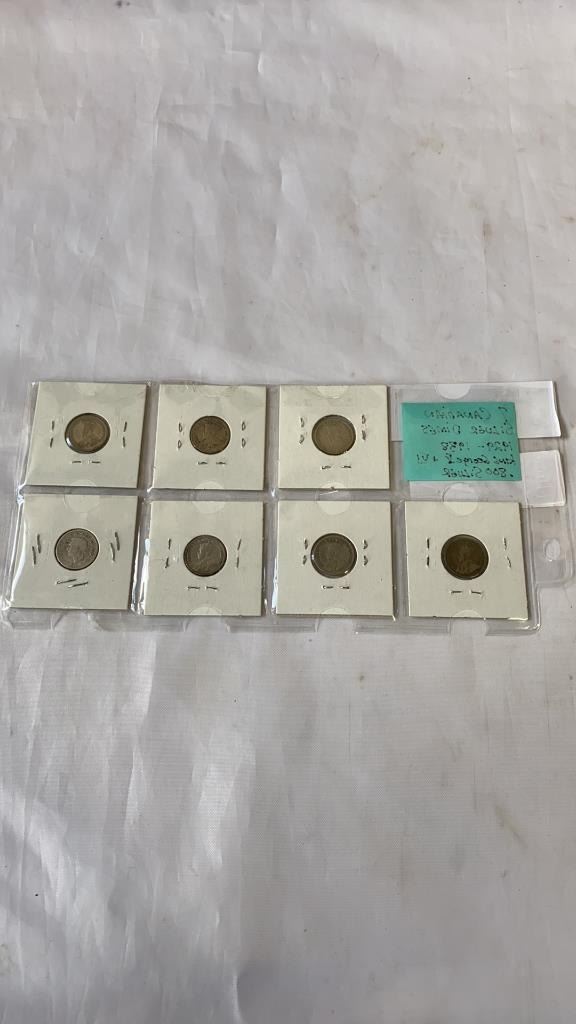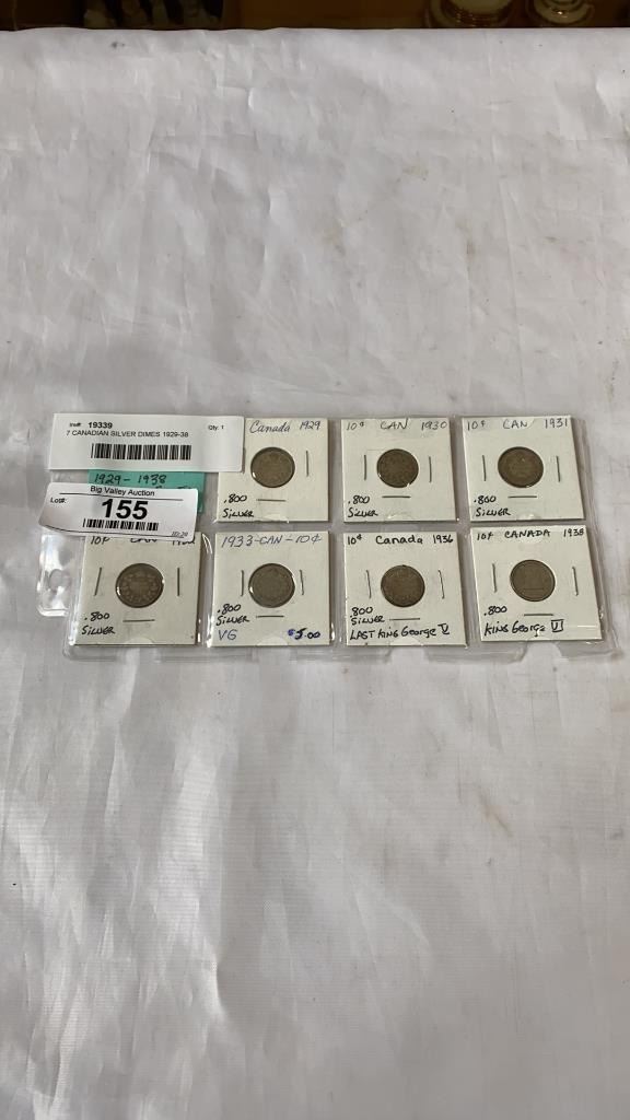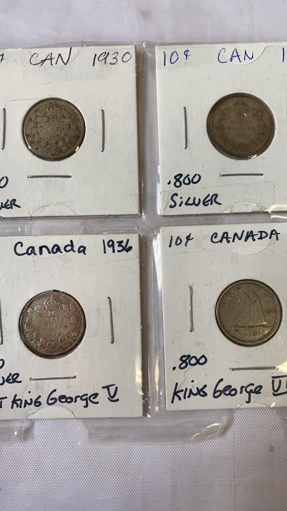 7 CANADIAN SILVER DIMES 1929-38 GEORGE V AND VI .800 SILVER