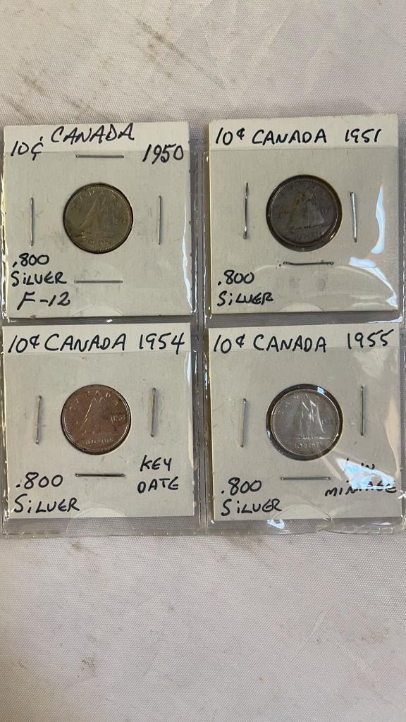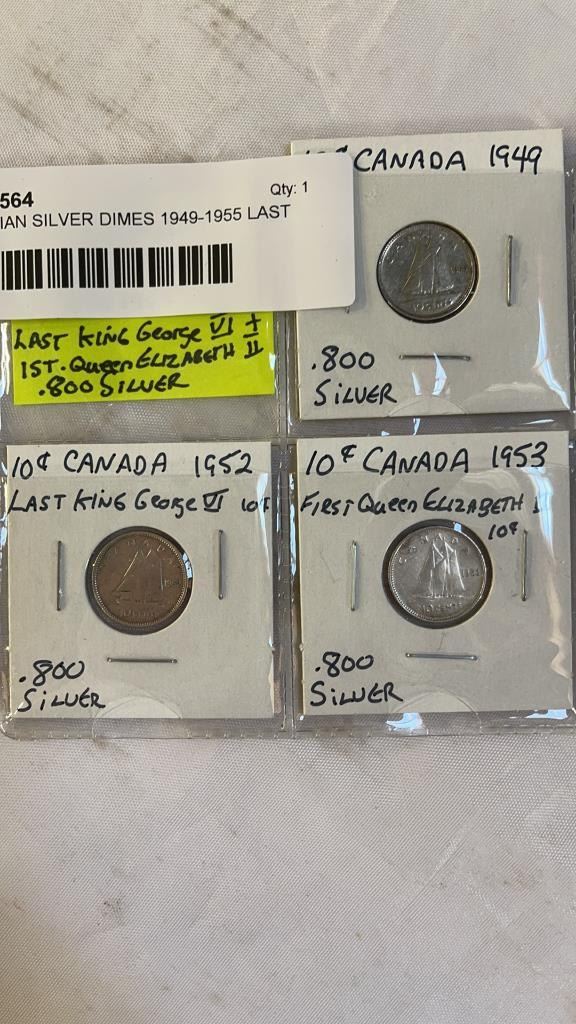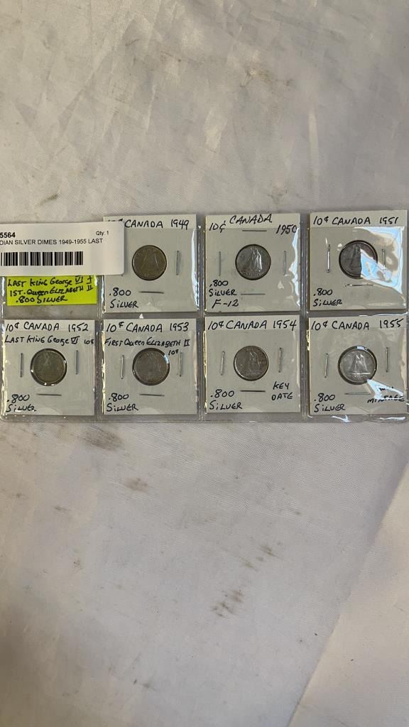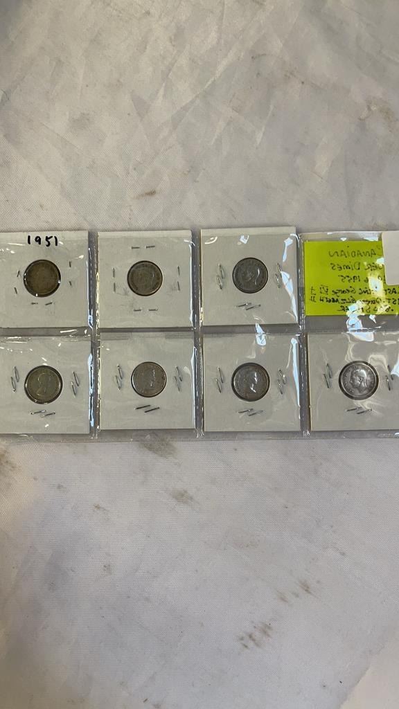 7 CANADIAN SILVER DIMES 1949-1955 LAST GEORGE VI AND FIRST ELIZABETH II .800 SILVER
