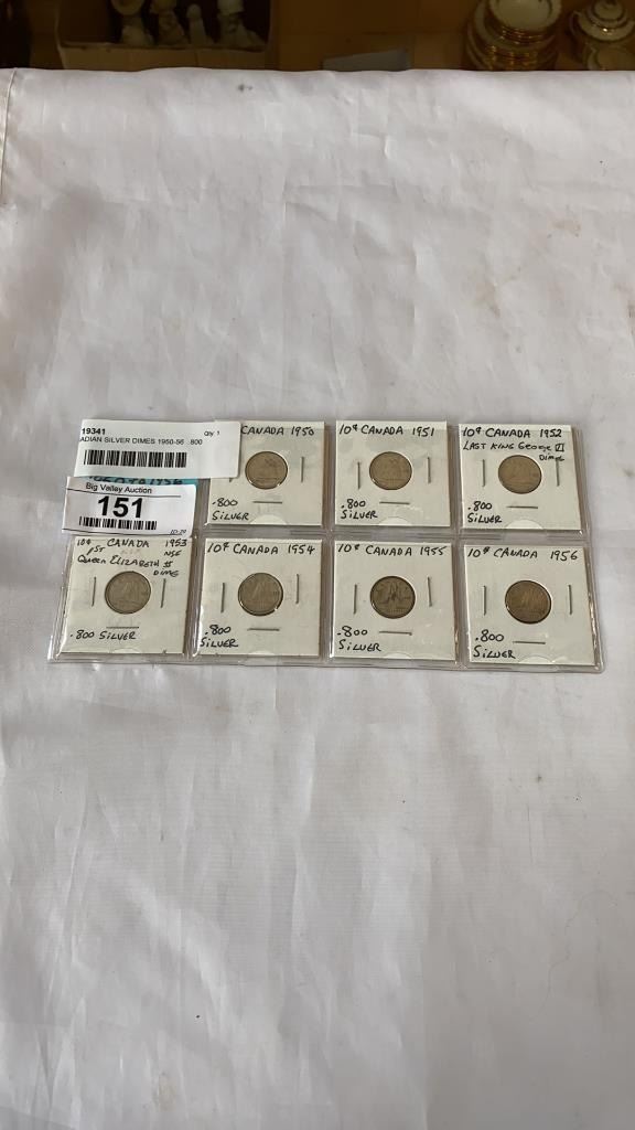 7 CANADIAN SILVER DIMES 1950-56 .800 SILVER