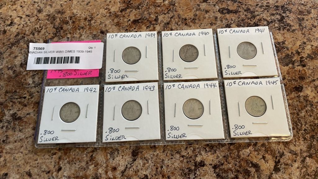 7 CANADIAN SILVER WWII DIMES 1939-1945 .800 SILVER