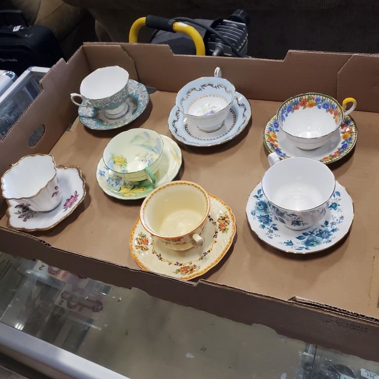 7 CUPS AND SAUCERS - ROAL ALBERT, QUEEN ANNE, GRASDENER, GRAFTON, ANYSLEY