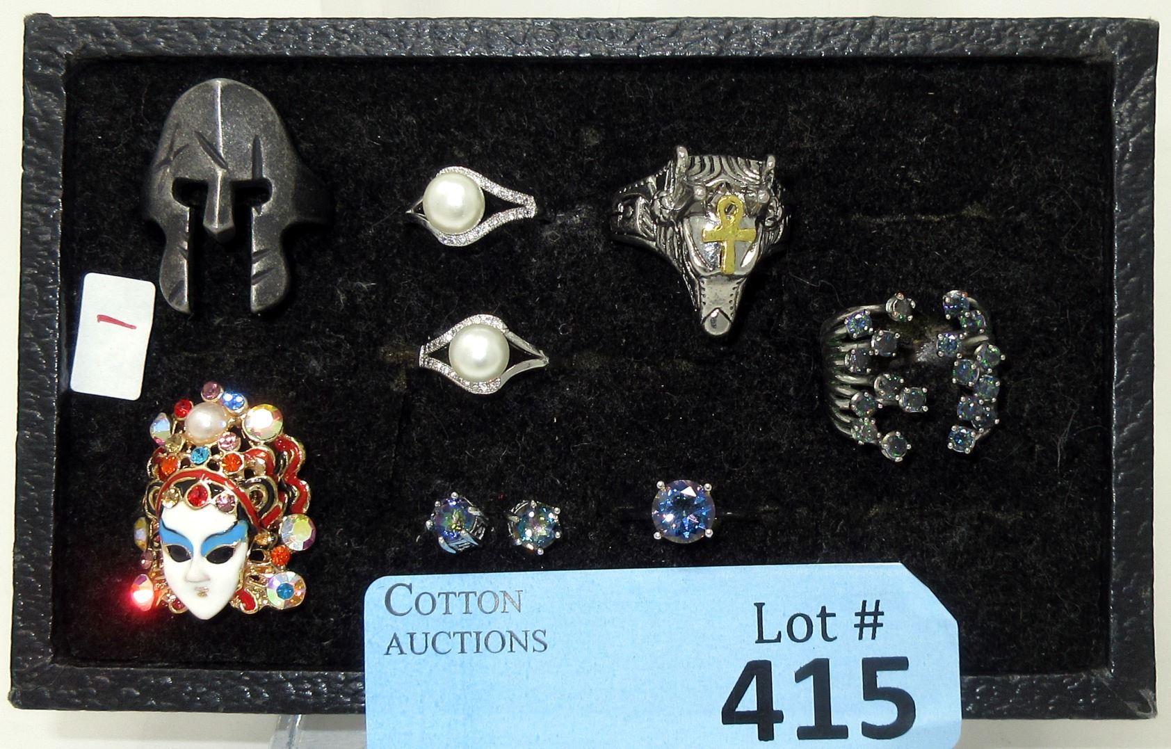 Earrings are Sterling Silver & Mystic Topaz. Rings are Centurion, Anubis Head, Faux Pearl, Rhinestone and Mystic Topaz