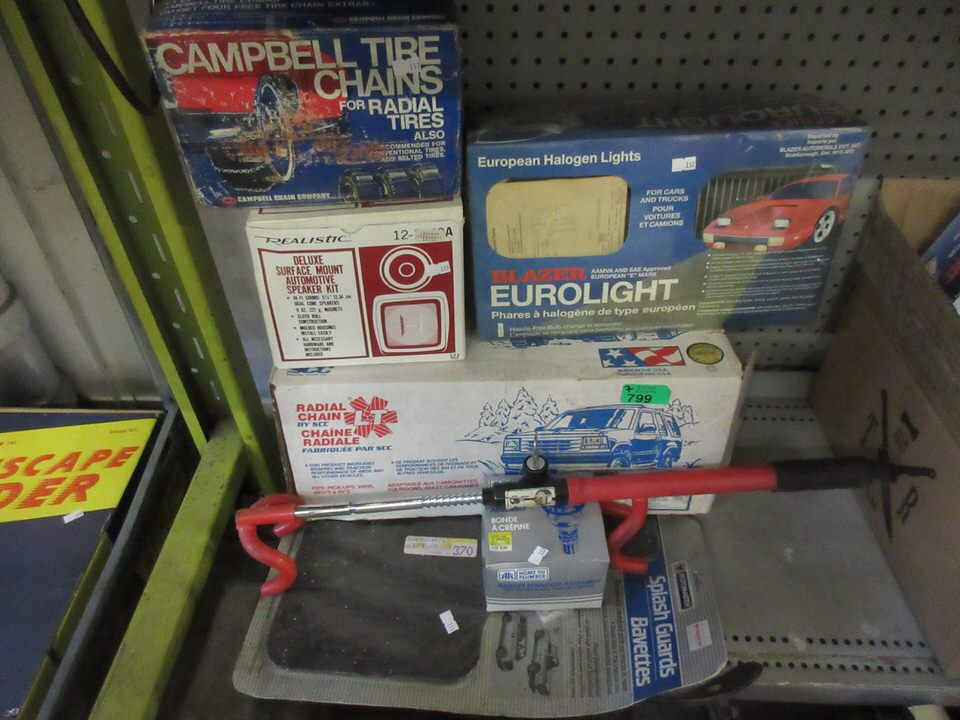 Halogen headlights, tire chains, speaker kit, steering wheel lock, and more.