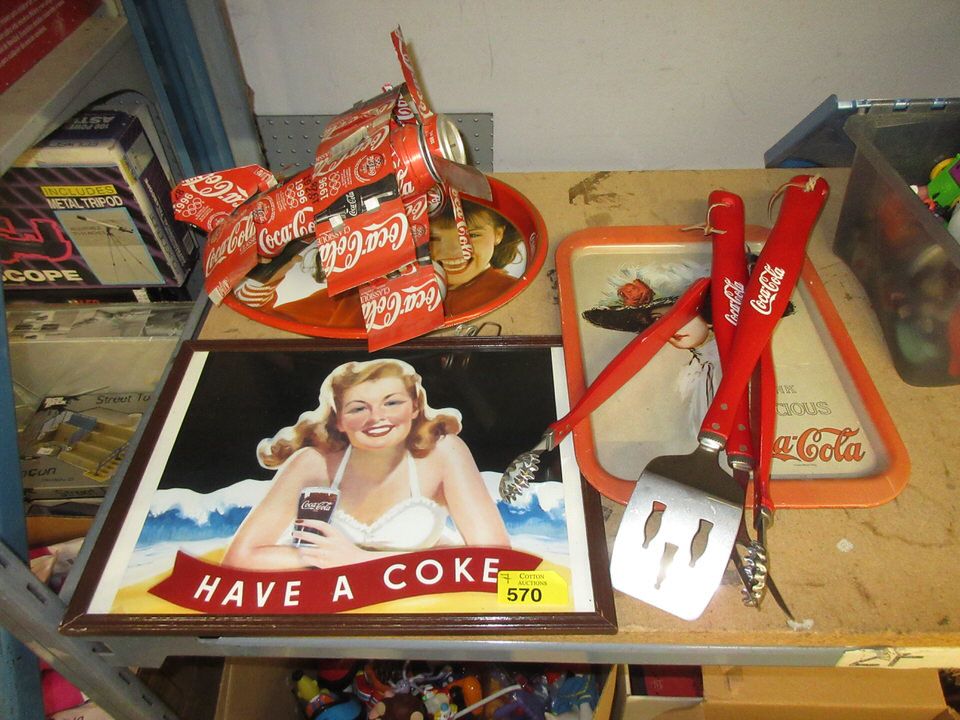 BBQ tools, 2 trays, framed ad, and bi-plane made from Coke cans.