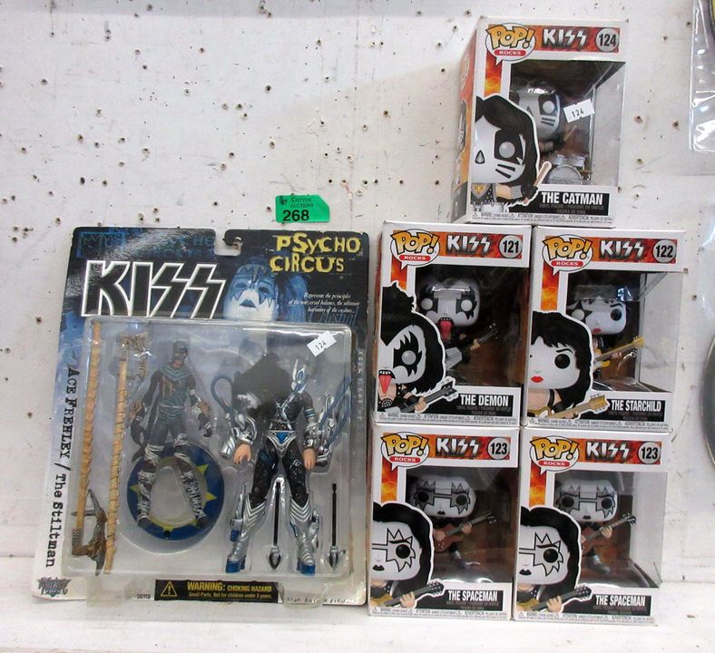 KISS Psycho Circus action figure and 5 Funko Pop vinyl collectibles.