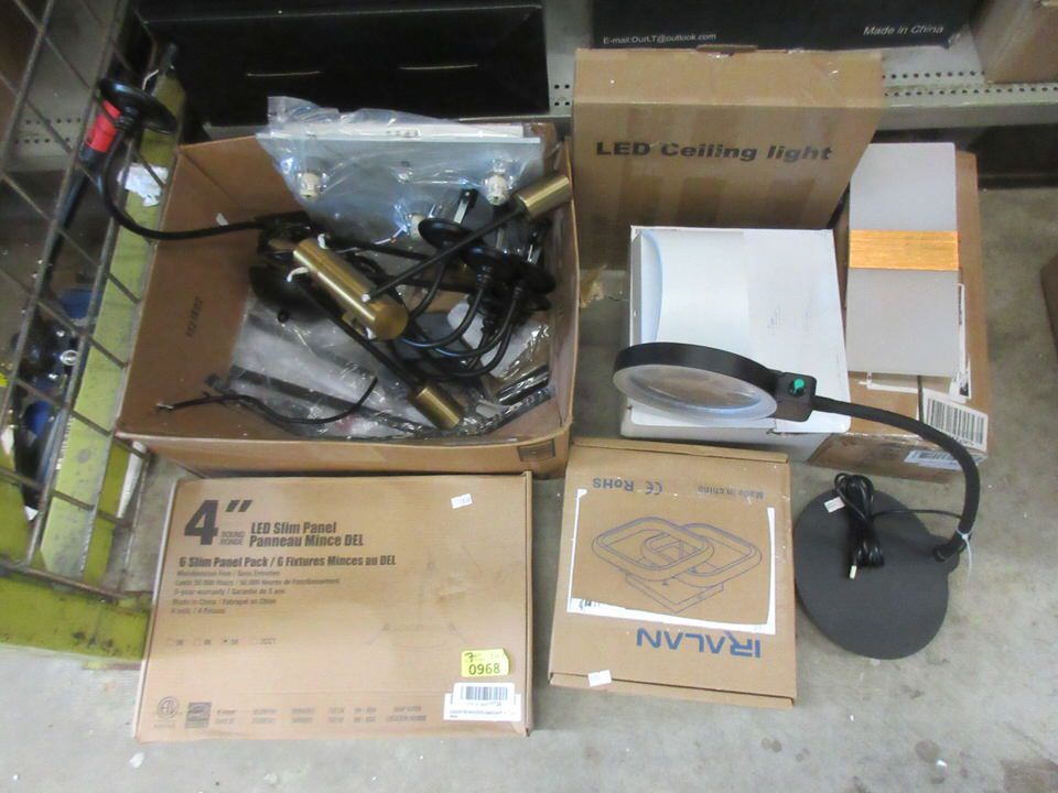 LED ceiling lights, magnifying lamp, slim panel LED lights, chandelier, and wall sconces.
