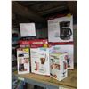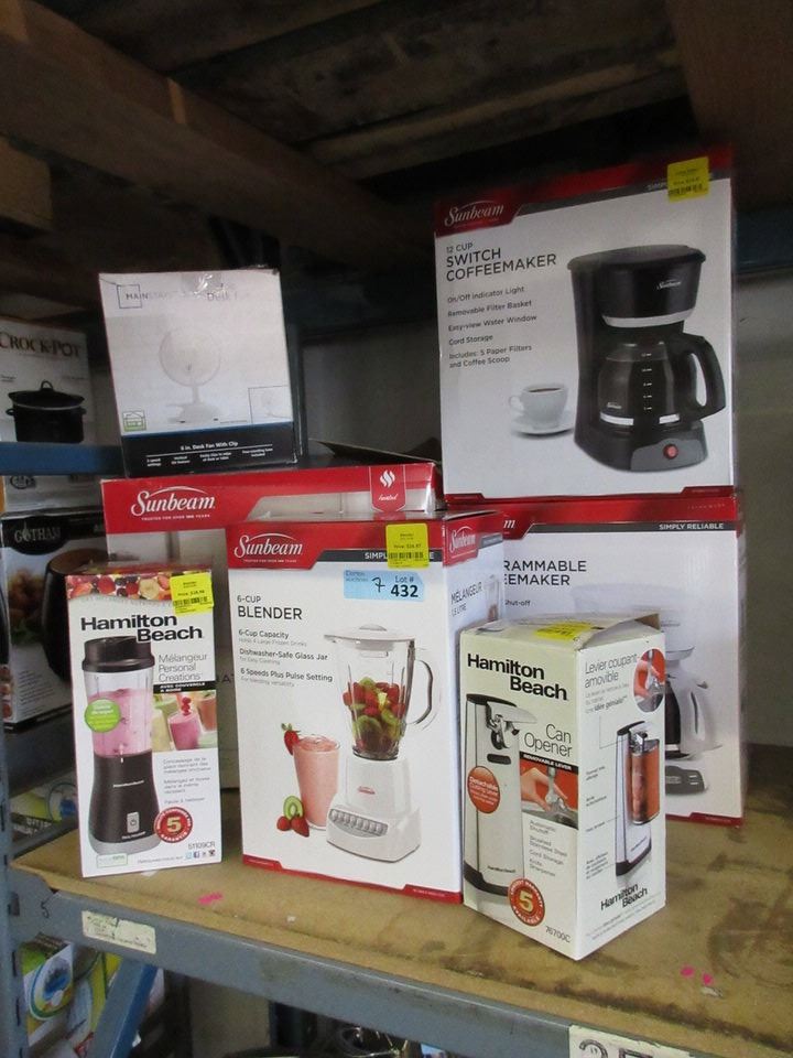 Coffeemakers, can opener, blender, personal blender, fan.