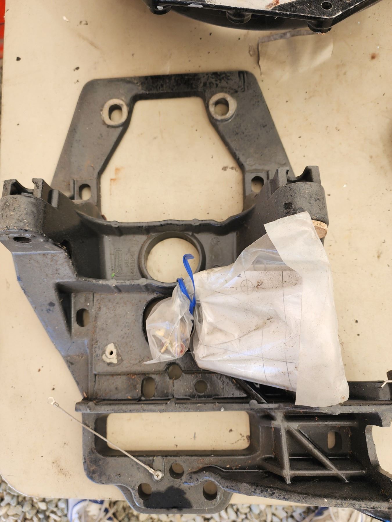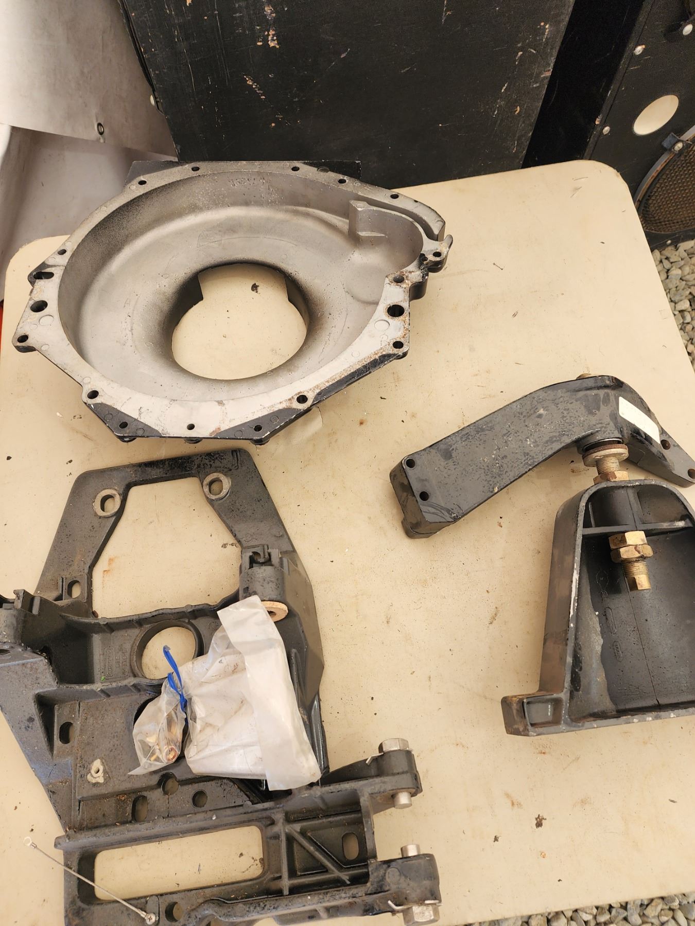 This set includes various pre-owned marine components suited for structural and mechanical applications. The lot features brackets, mounts with rubber bushings, large flywheel or bell housings, and support arms.