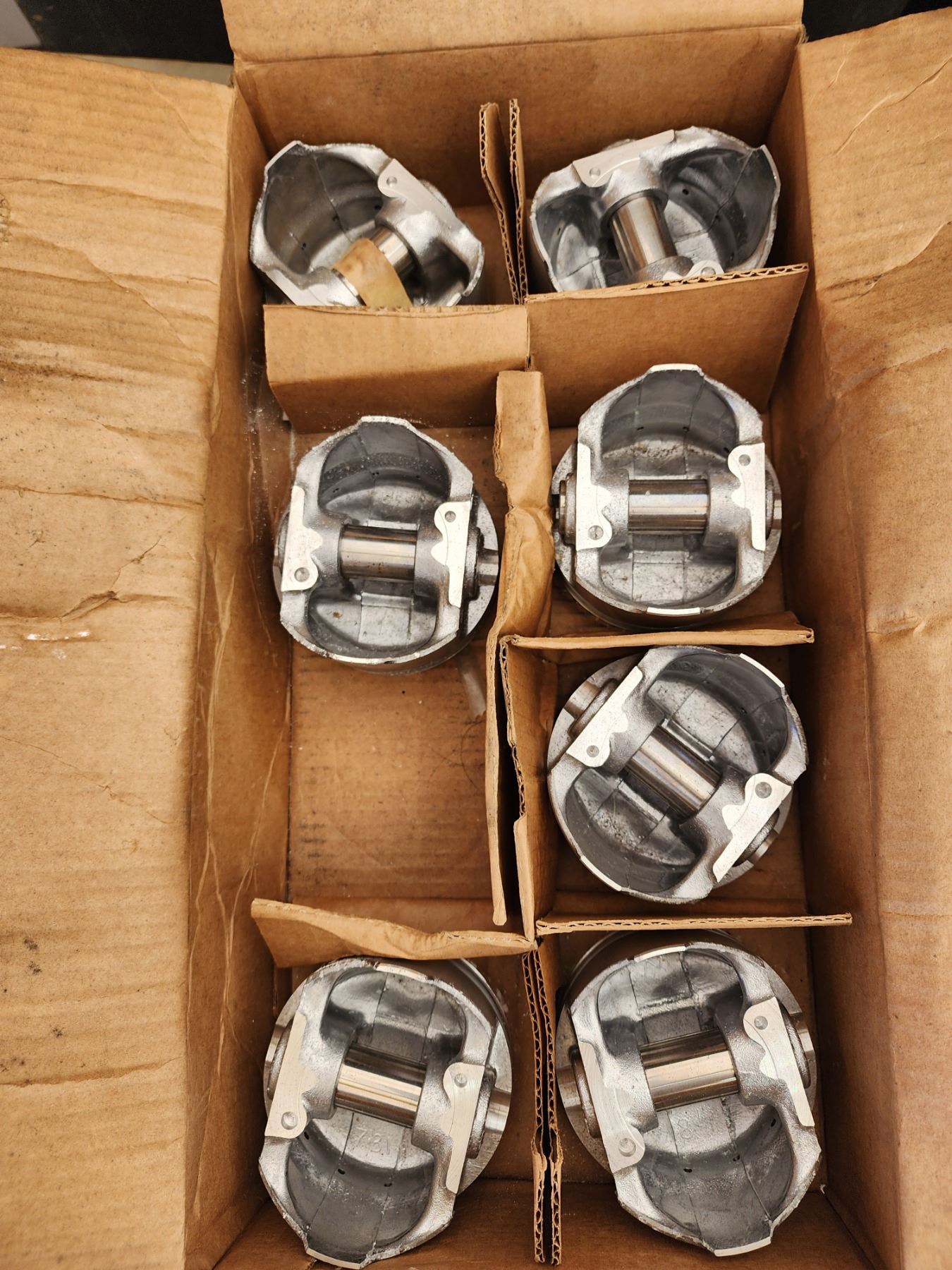 Set of seven unused marine-grade piston assemblies, suitable for engine rebuilds or custom marine applications.