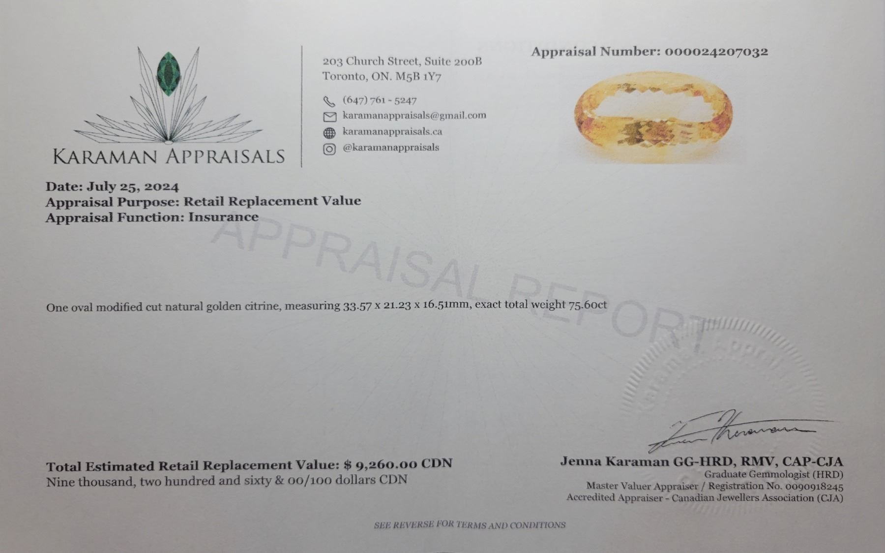 75.60 CT CERTIFIED MADEIRA CITRINE GEMSTONE ($9,260 APPRAISAL)