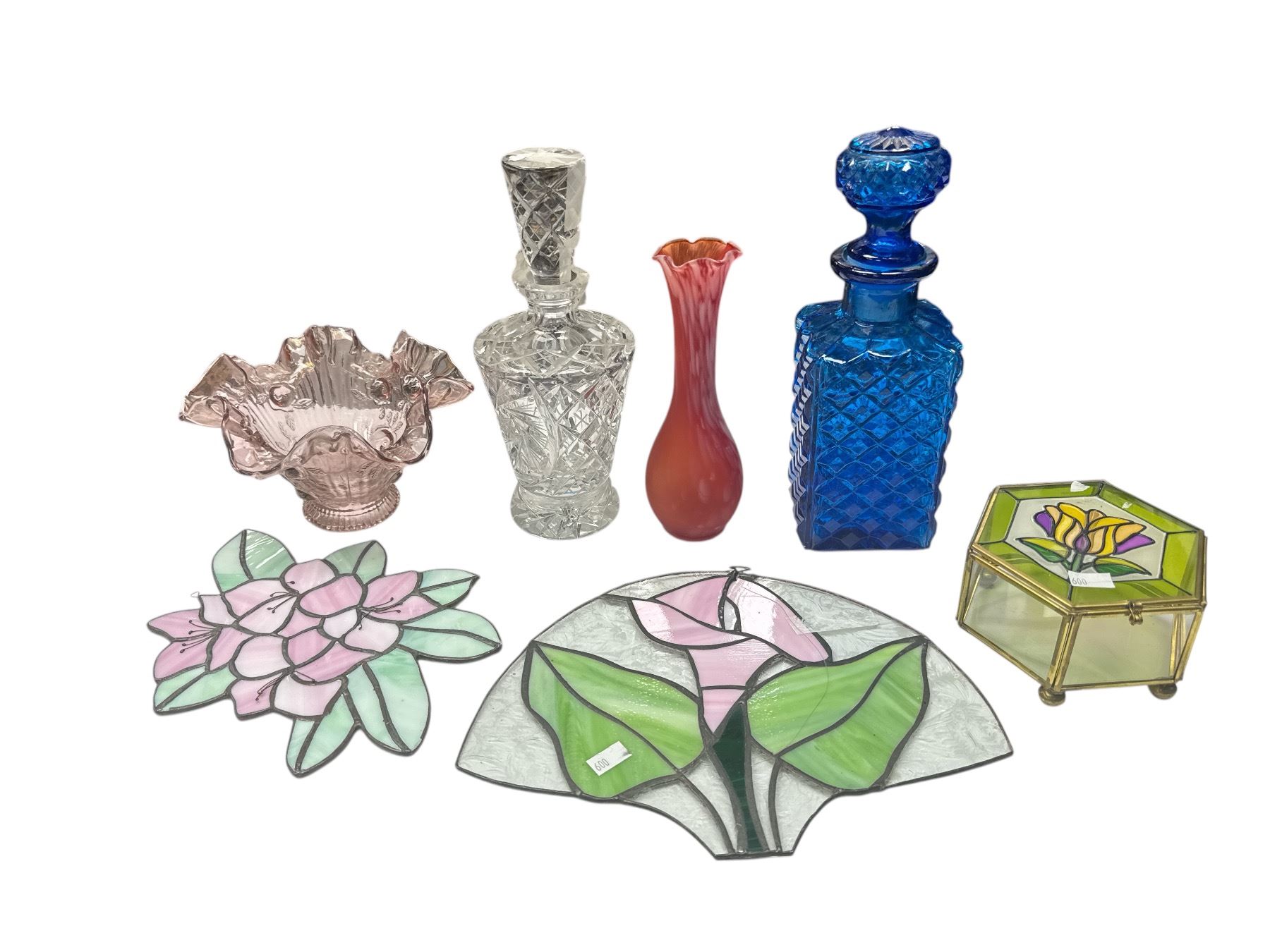 7pcs Of Art Glass: Container, Stain Glass Wall Art, Vase, & Decanters