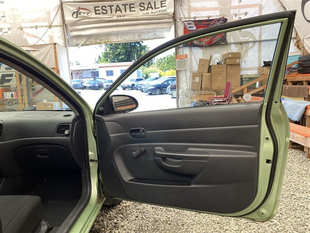 2008 HYUNDAI ACCENT, GREEN, 235674 KMS, 1.6L, 4 CYLINDER, GASOLINE, AUTOMATIC, TRANSMISSION, FRONT WHEEL DRIVE, 5 PASSENGER. TILT STEERING, ANTI THEFT, DUAL AIR BAGS, CD PLAYER, SPLIT-FOLDING REAR SEATS. DECLARATIONS: NO DESIGNATIONS 1 ACCIDENTS 2 GLASS CLAIM, TOTALLING $1952. SERVICE HISTORY SHOWS8 RECORDS. AUCTION NOTES: STOCK #: B085875 NOT MECHANICALLY INSPECTED, NOT SUITABLE FOR TRANSPORTATION, MUST TOW.