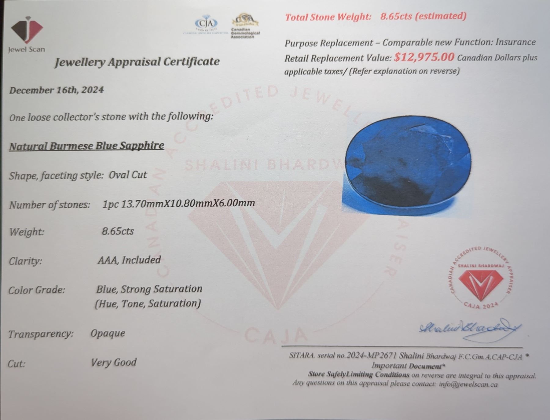 8.65 CT CERTIFIED MED BLUE SAPPHIRE GEMSTONE ($12,975 APPRAISAL) **APPRAISAL NOT GUARANTEED**