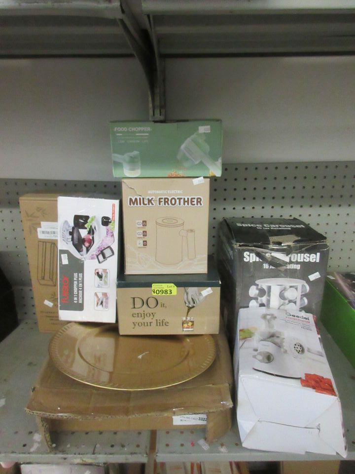 Wrap dispenser, milk frother, food choppers, grinder, spice rack, charger plates & cocktail set.