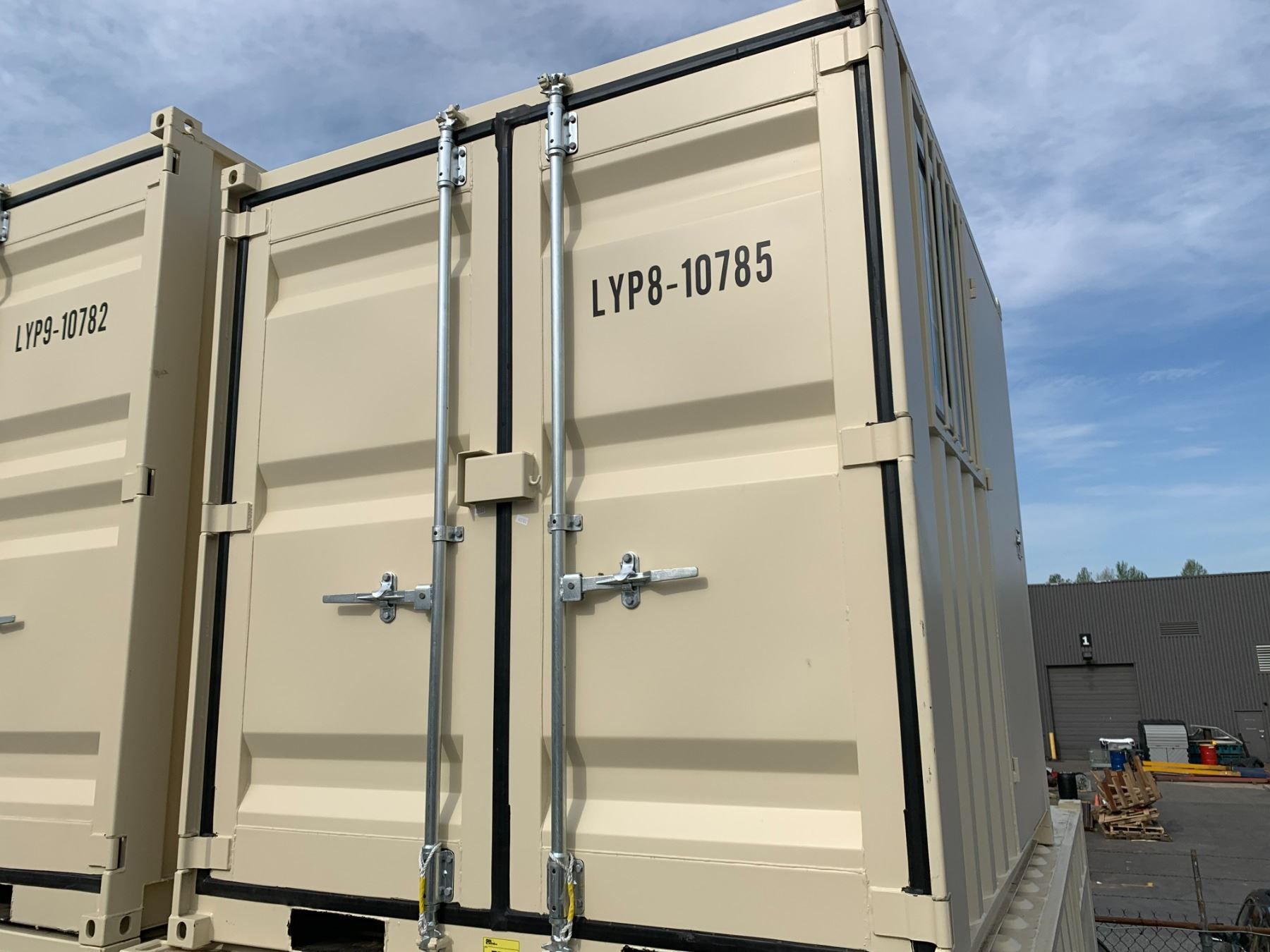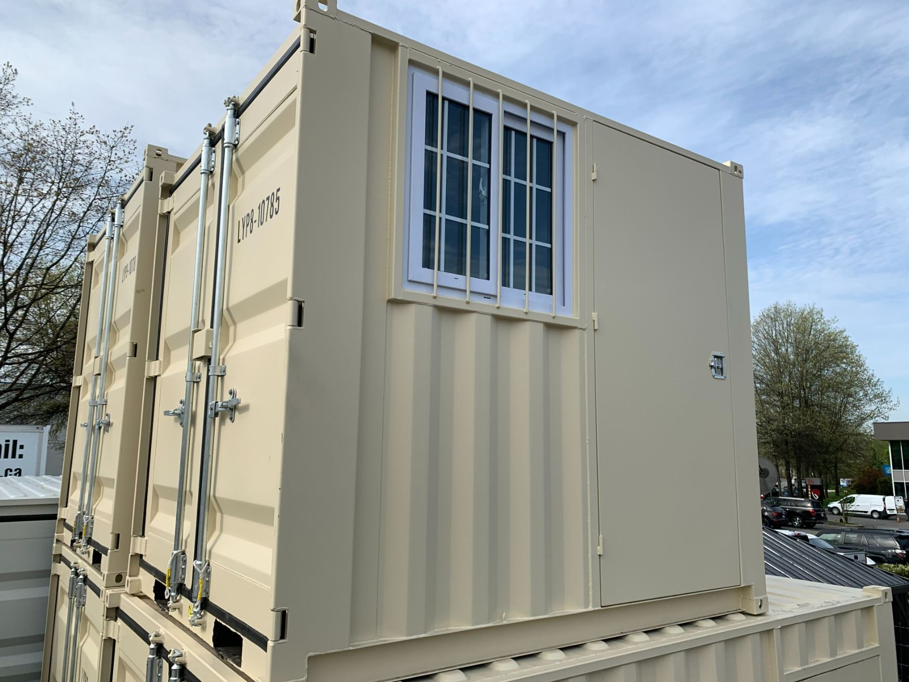 8' BEIGE PORTABLE OFFICE CONTAINER W80" X L98" X H89" WITH WINDOW, LOCKING MAN DOOR, WOOD FLOOR, & DUAL SWING CAM LOCK REAR DOORS