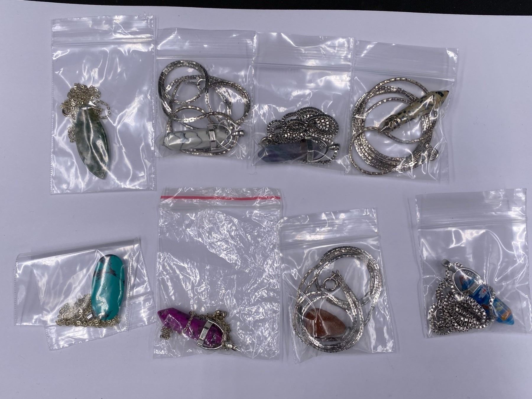 8 GEMSTONE PENDANTS; HOWLITE, DALMATIAN JASPER X 2, MURANO GLASS, TURQUOISE, SUGLITE, SANDSTONE, MOSS AGATE, FLOURITE