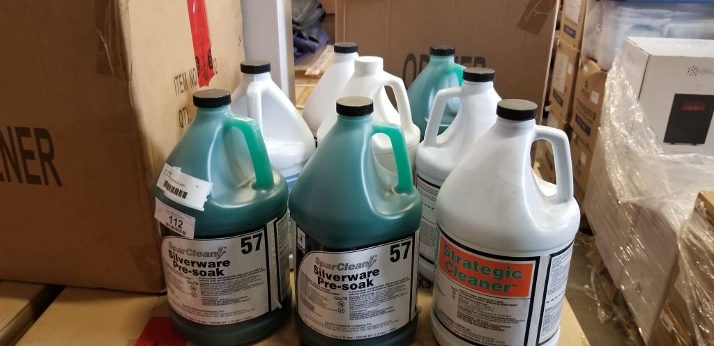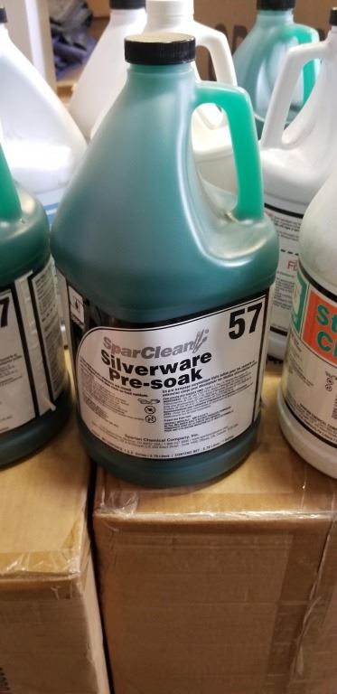 8 NEW JUGS OF SILVERWARE PRE SOAK, CLEANERS AND DETERGENTS
