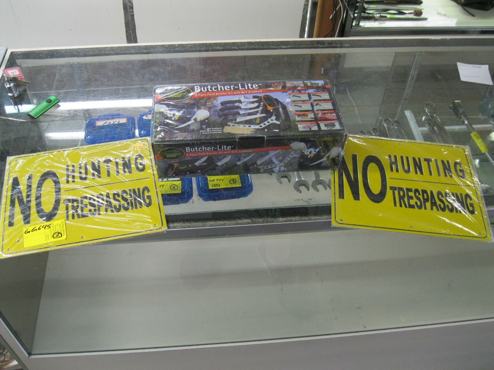 8 PCE BUTCHER KIT WITH BELT SCABBORD AND TWO NO HUNTING TRESPASSING SIGNS