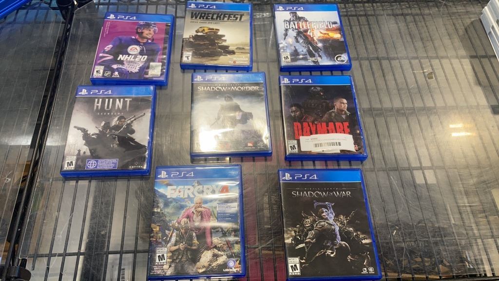 8 PLAYSTATION 4 VIDEOGAMES INCLUDING HUNT SHOWDOWN, MIDDLE EARTH SHADOW OF MORDOR AND SHADOW OF WAR, FARCRY 4, BATTLEFIELD 4 AND OTHERS