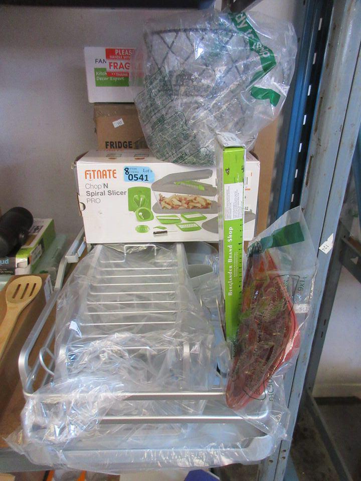 Dish drying rack, chop and spiral slicer, spice jars, fridge organizer, and more.