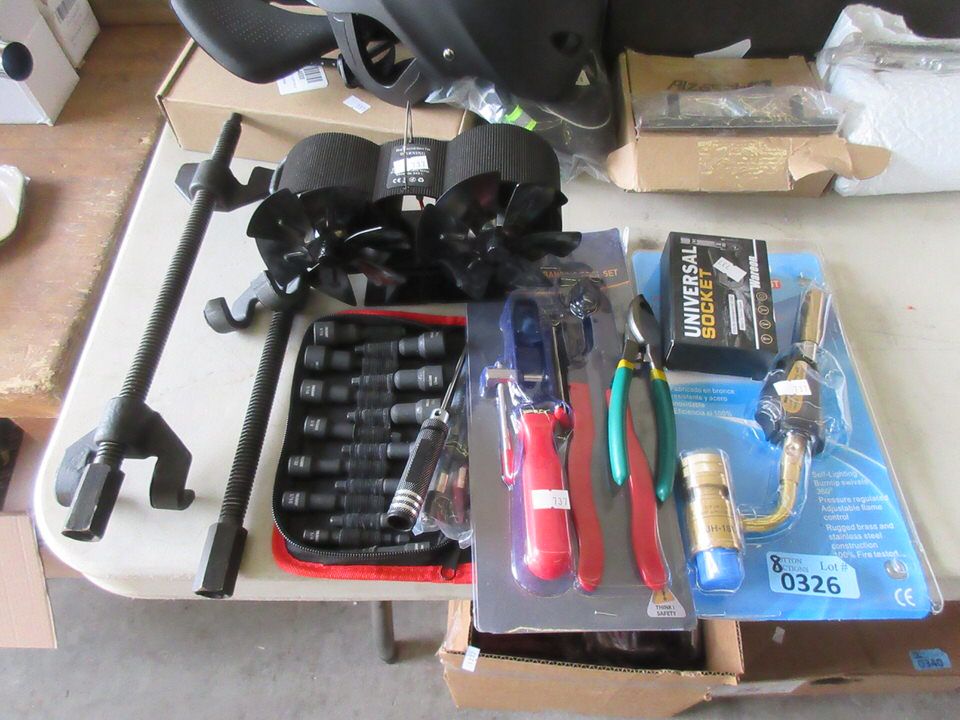 Universal socket, heat powered stove fan, hand torch, cv joint clamping band set and more.