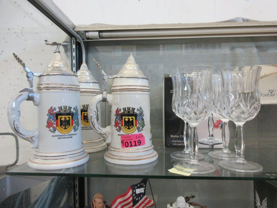Roma wine glasses. 3 Baden Officers Mess Steins & 1 HB Tankard.