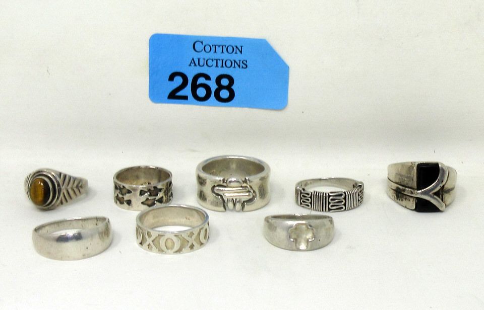 Two rings have unidentified stones. Rings are stamped. One ring is stamped Birks.