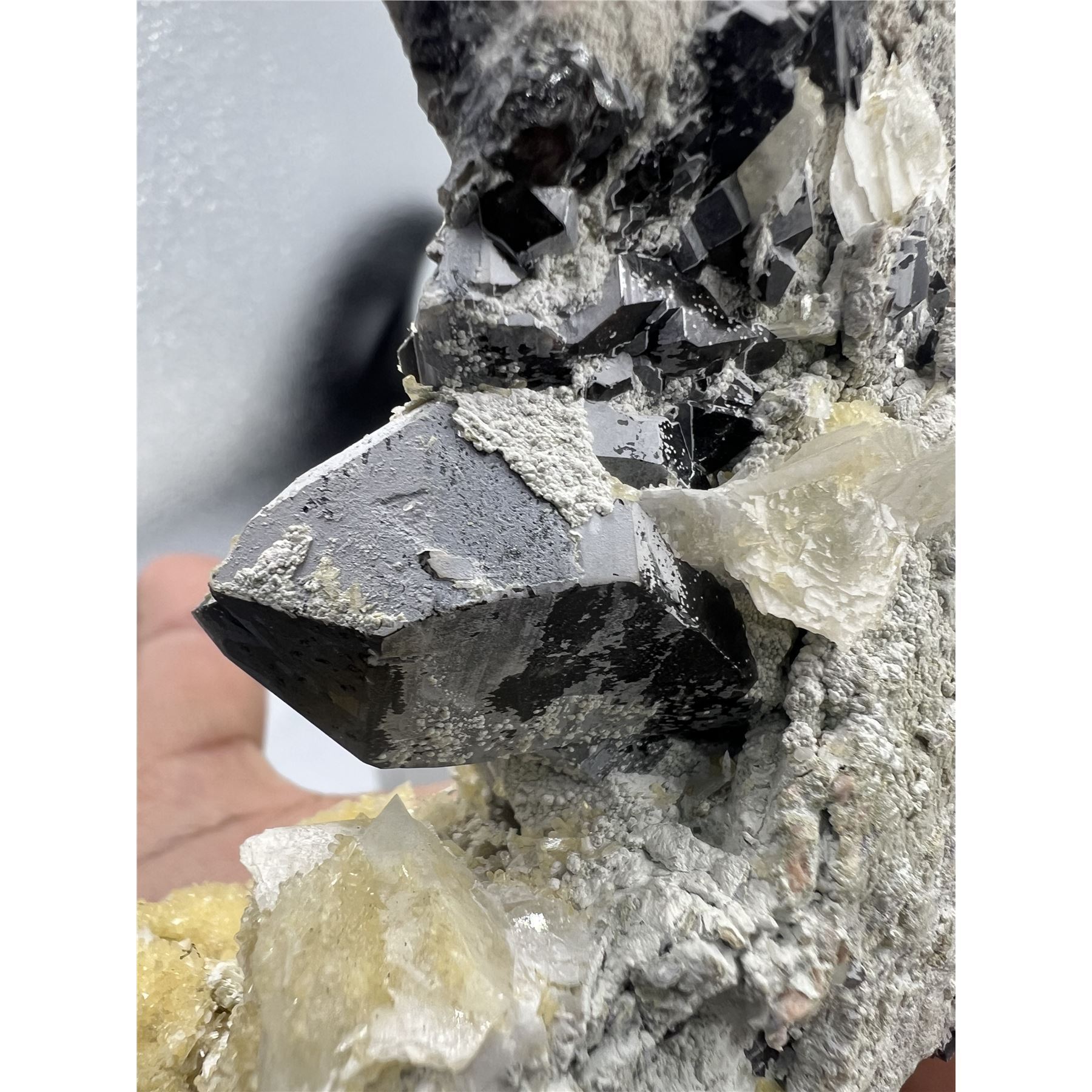 8 X 8 INCH BLACK CRYSTAL WITH YELLOW CALCITE QUARTZ SPECIMEN ON STAND