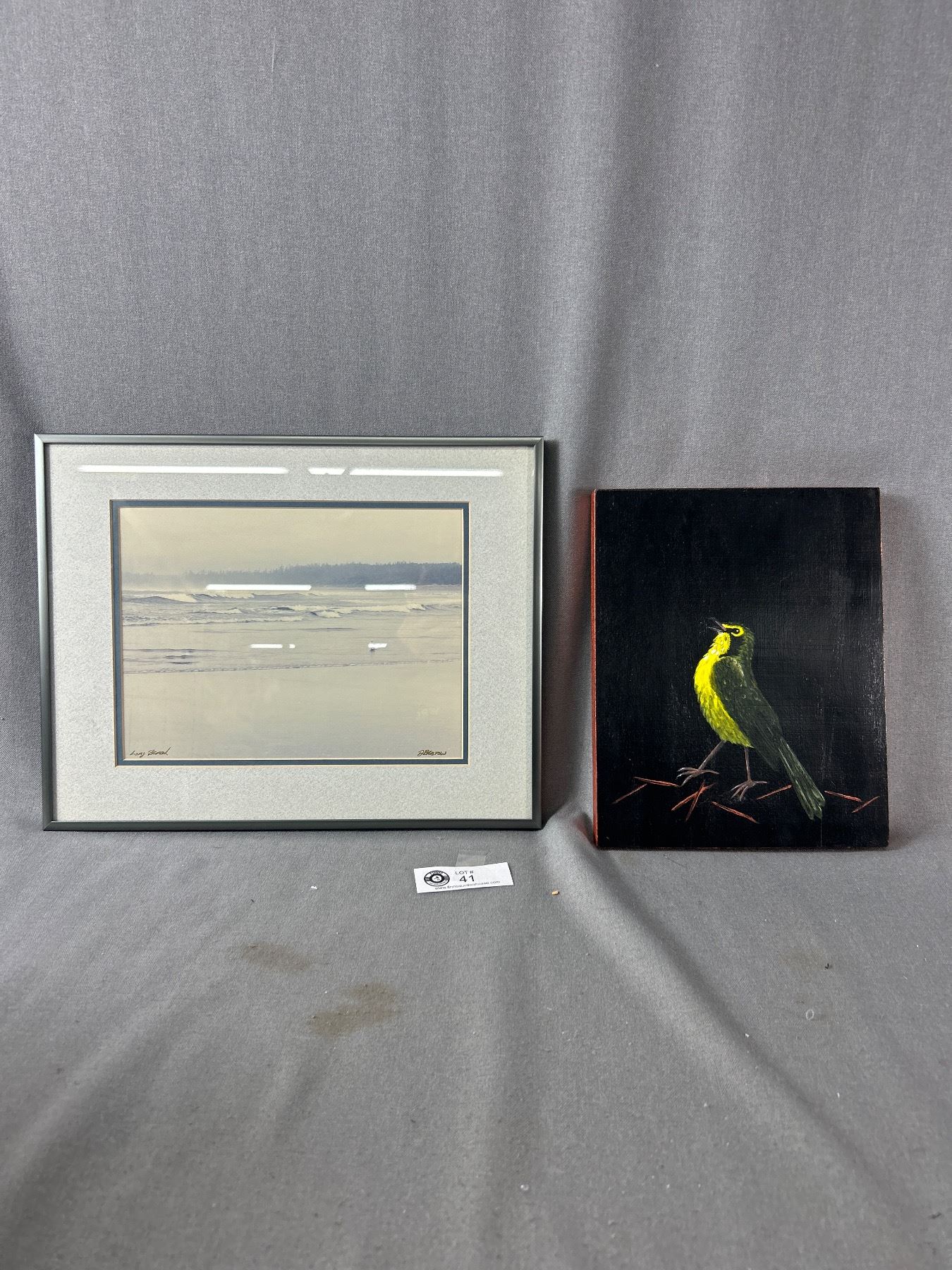 8" x 10" Bird Painting On Wood & Signed Dave Bristow Long Beach Photograph. Approx. 14" x 11"