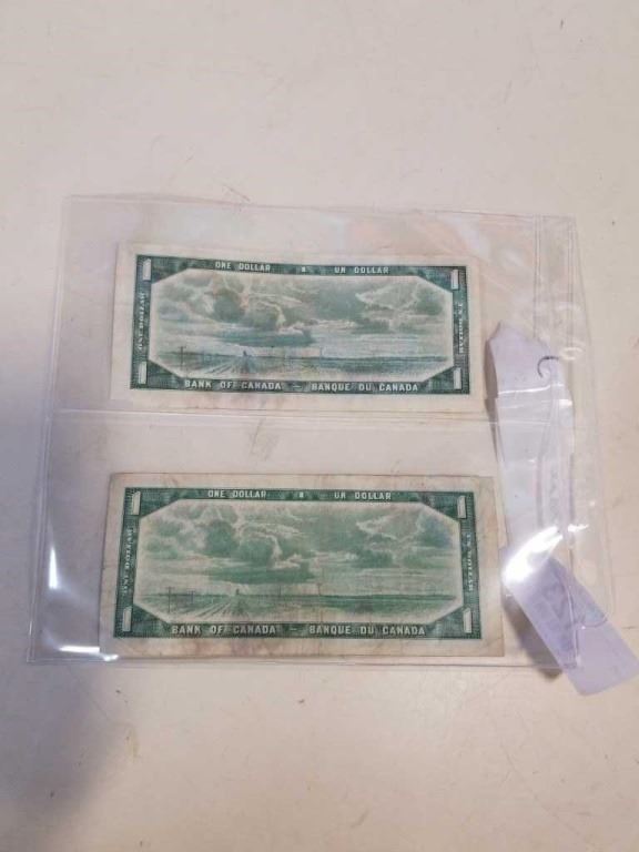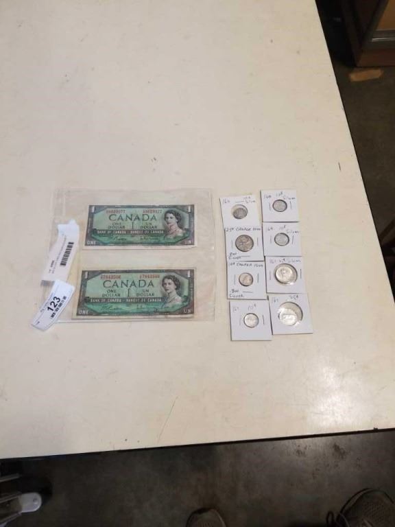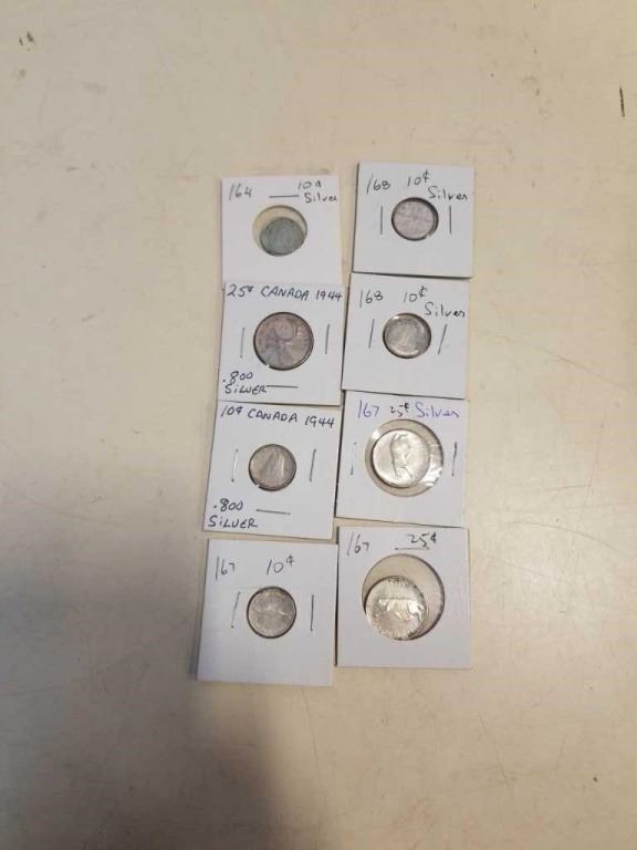.800 SILVER DIMES AND QUARTERS AND 2 1954 CANADIAN PAPER DOLLARS- 1944-68 DIMES VARIOUS DATES AND 1944 AND 67 QUARTERS