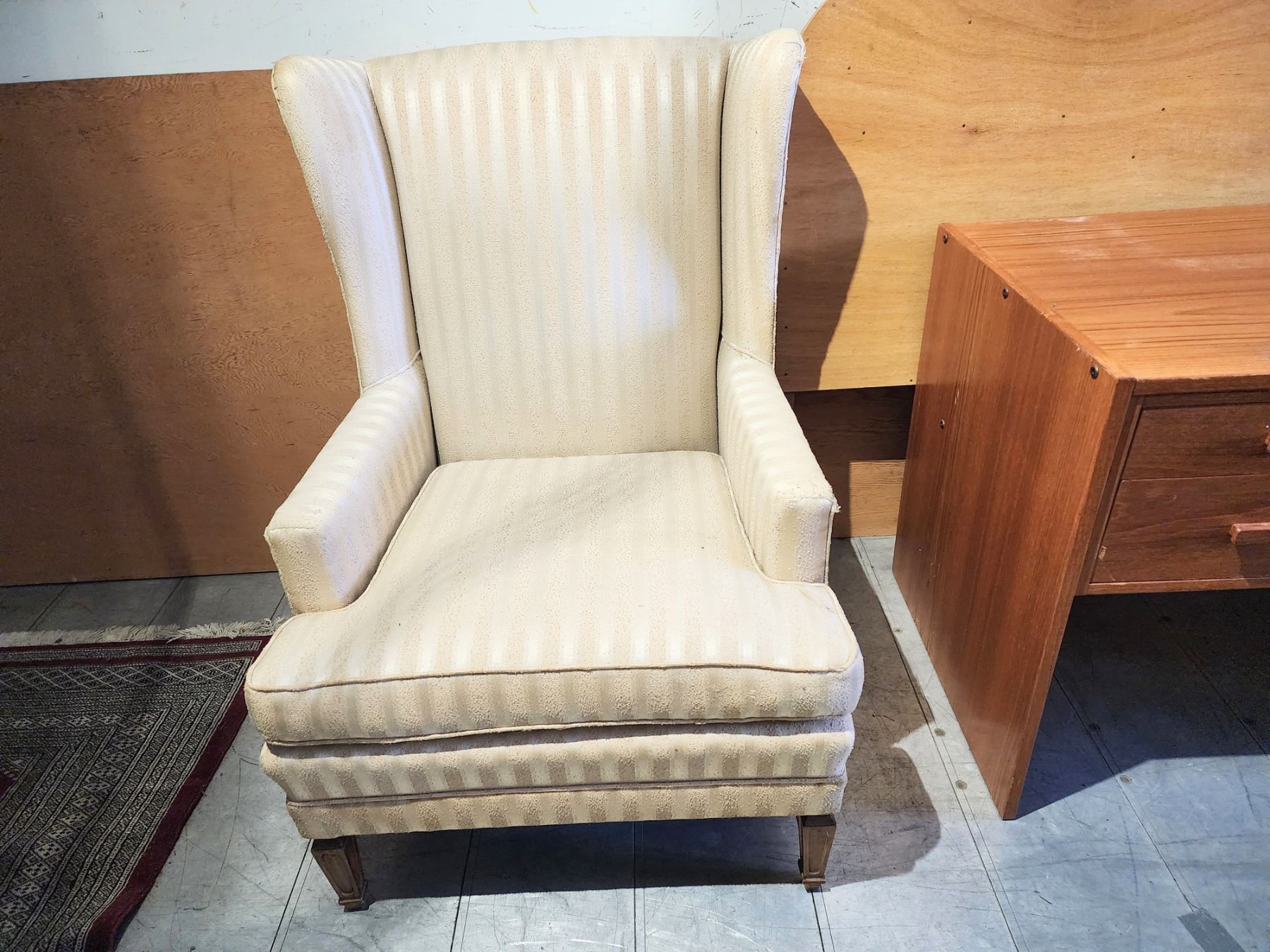 806 -- CREAM STRIPED WING BACK CHAIR AND MATCHING FOOT STOOL