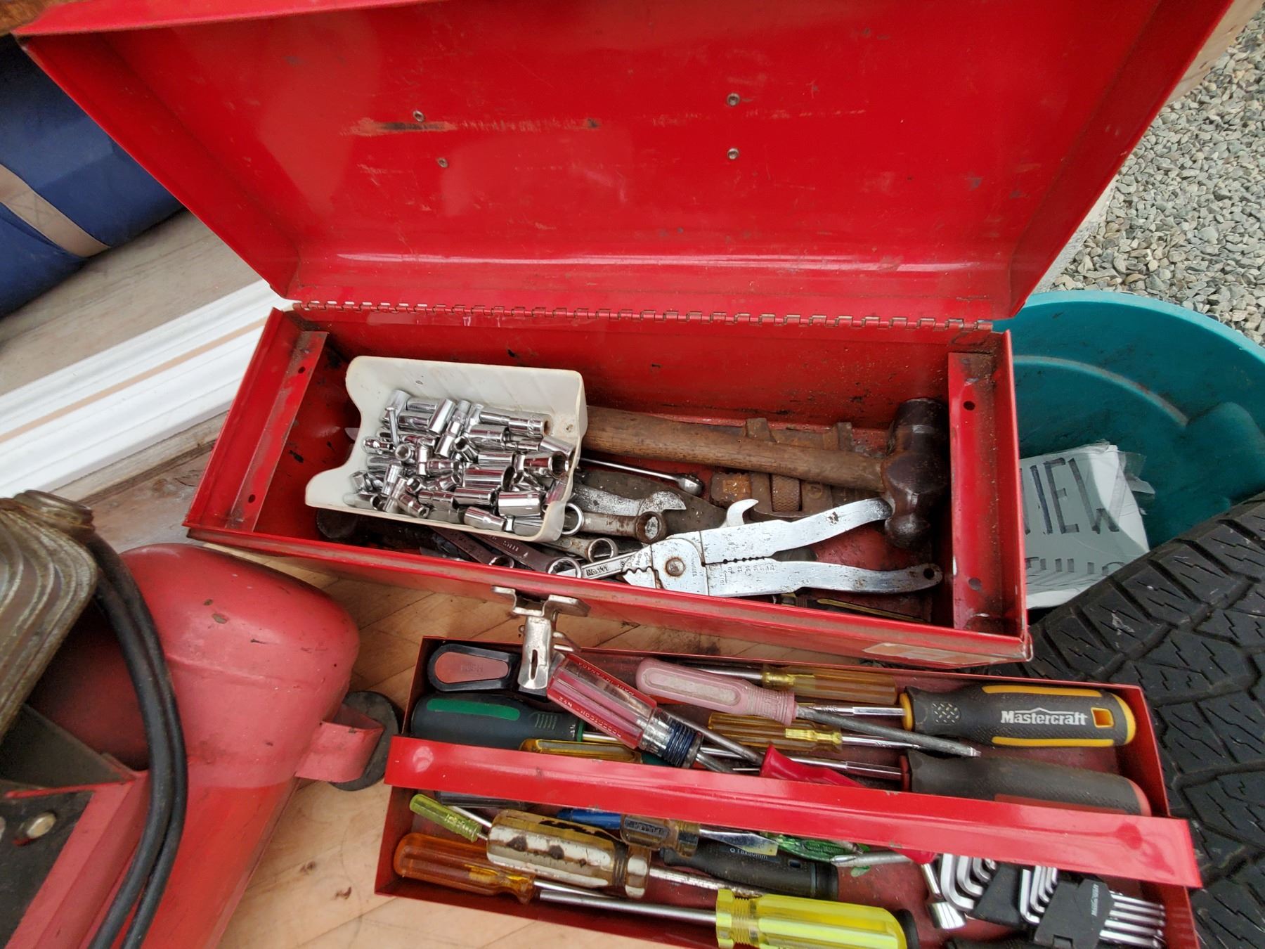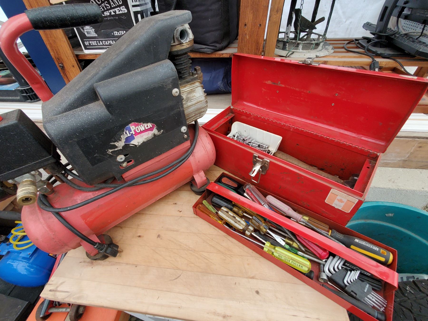 Small Air Compressor & Tools Box - 17% Buyer Fee. Payment Processed through Live Auction World ( Visa or Master Card ) pick up Saturday, or Tuesday