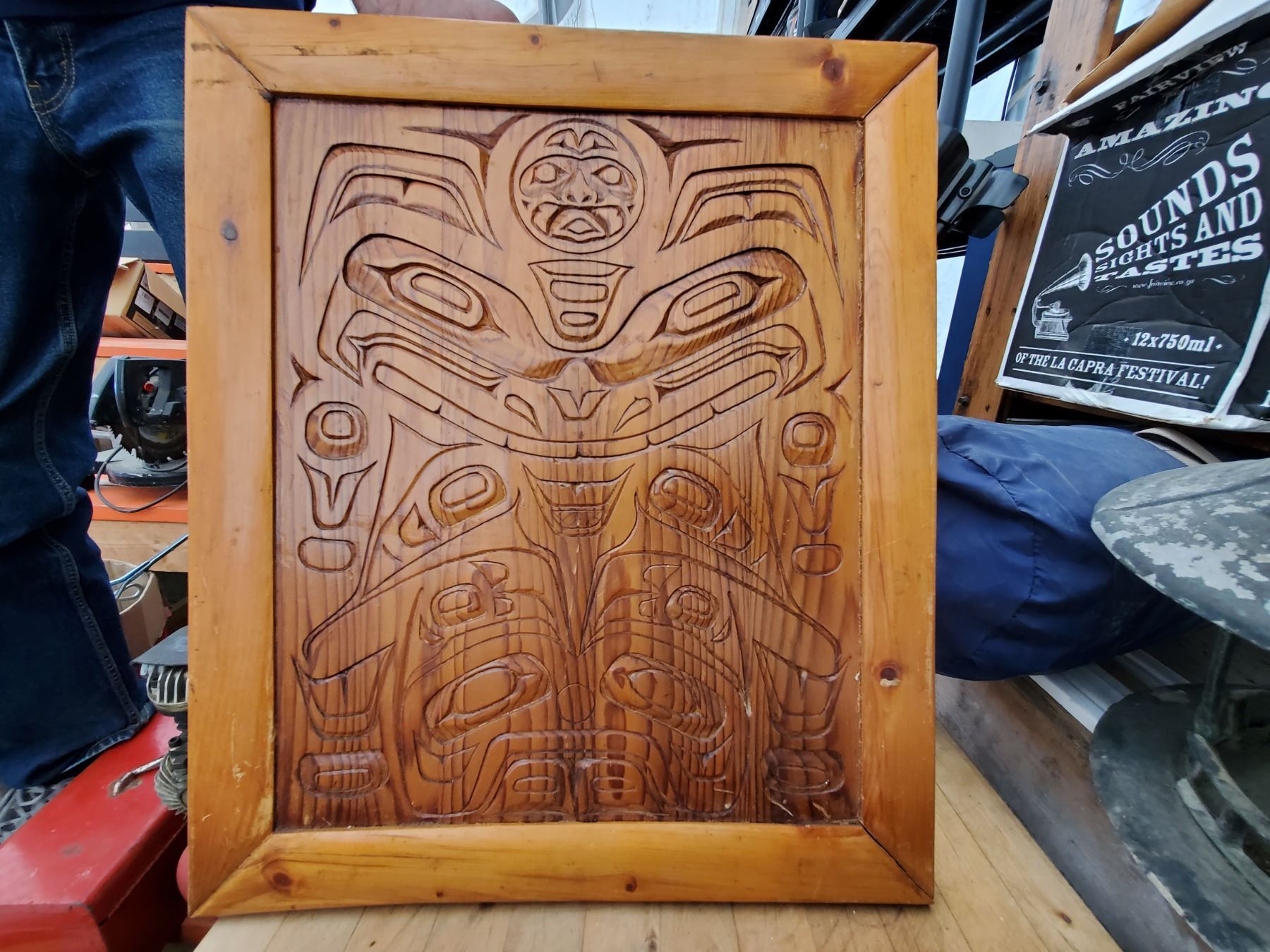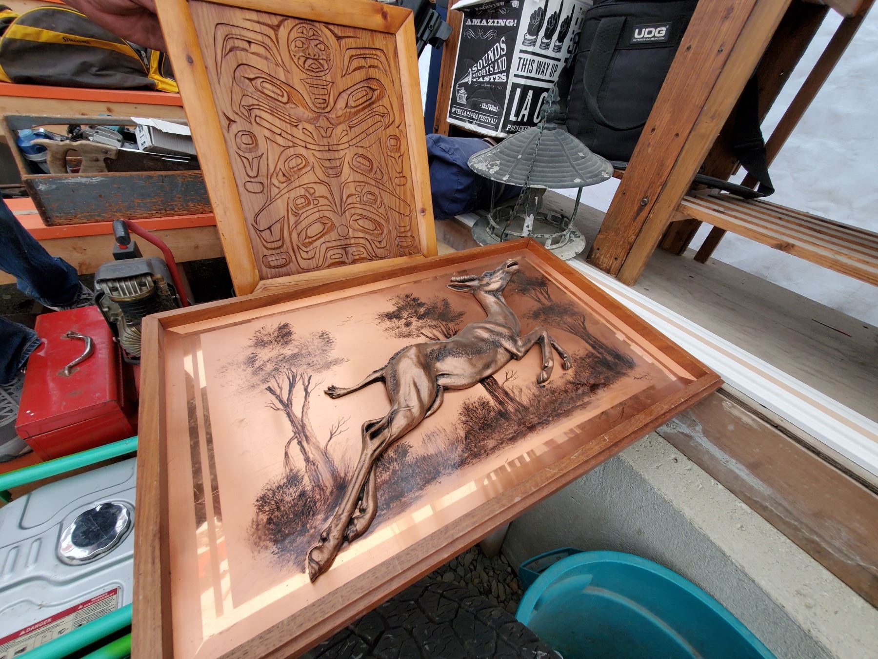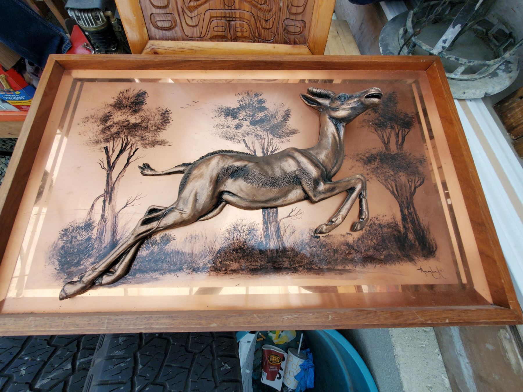 Large metal picture & native Carving - 17% Buyer Fee. Payment Processed through Live Auction World ( Visa or Master Card ) pick up Saturday, or Tuesday