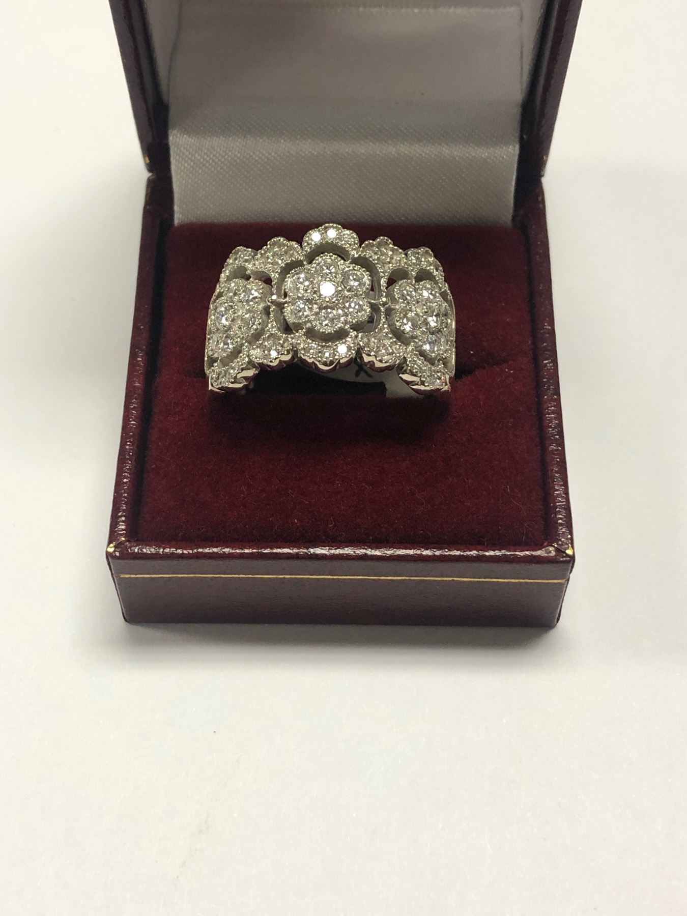 $9,000 Lady's stamped 14K, custom made, white gold, wide style, diamond floral band with open cut-out center design ring With Appraisal (ESTIMATED APPRAISED VALUE $9,000.00) - ring box not included