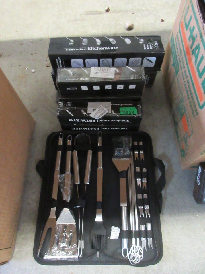 2 Boxes of kitchen utensils, 1 BBQ tool set and 6 Salad Serving sets.