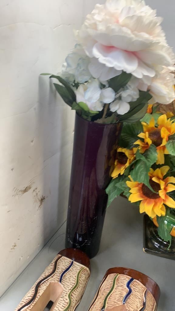 9 FLOOR MATS VARIOUS SIZES AND 4 VASES WITH SOME ARTIFICIAL PLANTS