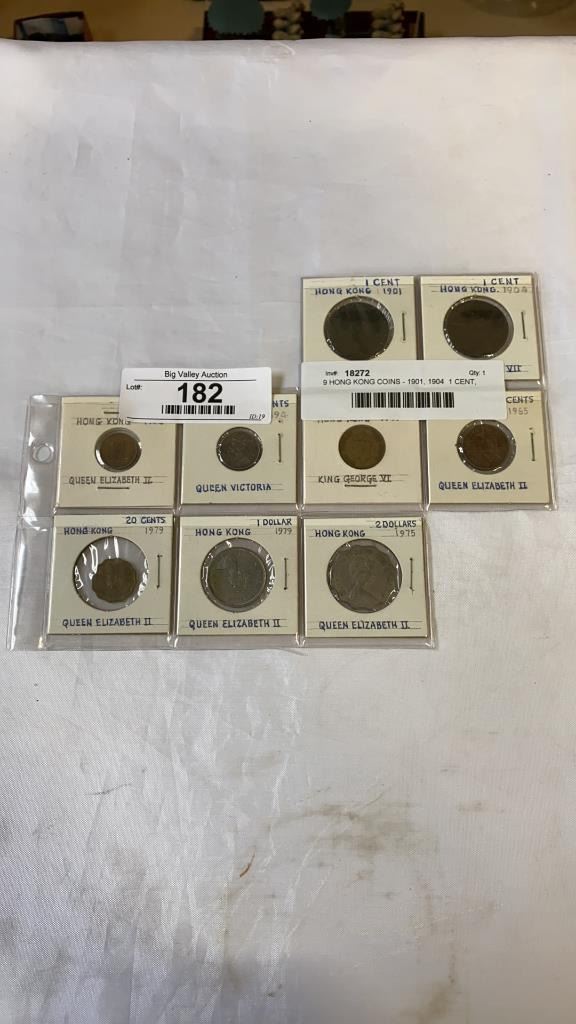 9 HONG KONG COINS - 1901, 1904 1 CENT, 1958 5 CENT, 1894, 1949, 1965 10 CENT, 1979 20 CENT, 1979 1 DOLLAR, 1975 2 DOLLAR