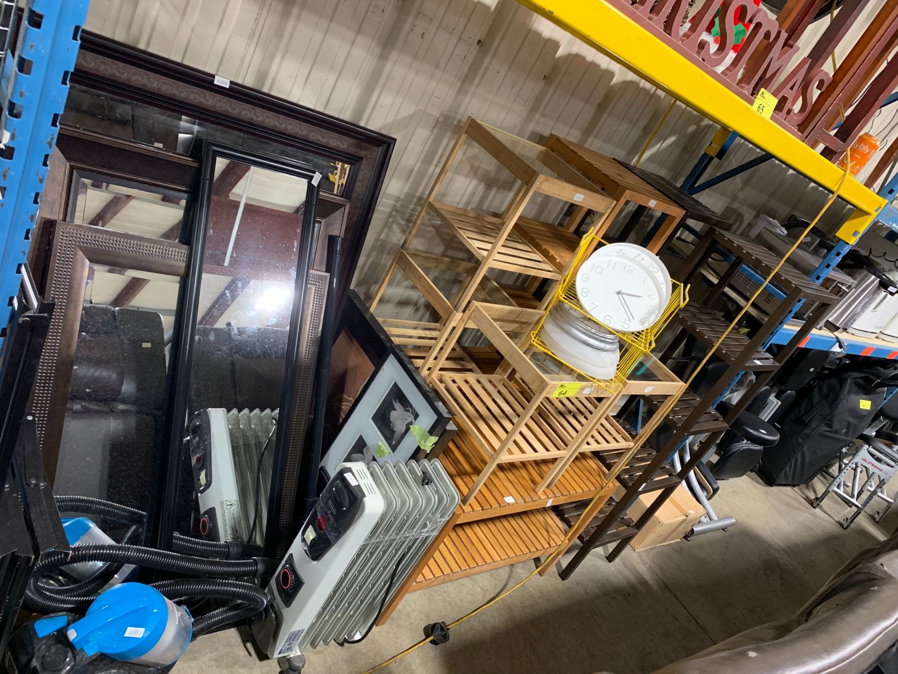 9 PCS OF ASSORTED SPA SHELVING, FRAMED MIRRORS, ARTWORK, CLOCKS, BISSELL VACUUM WITH HOSE, & DELONGHI ELECTRIC MOBILE RADIANT HEATER