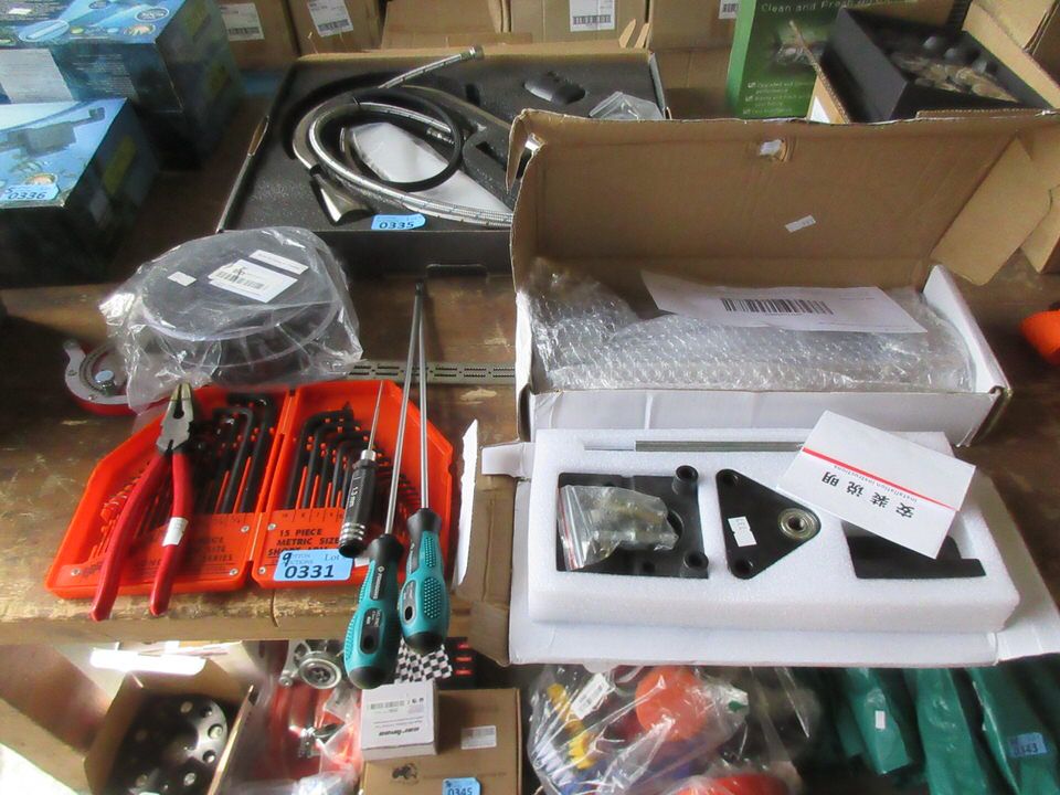 Pressure washer undercarriage attachment, long screwdrivers, long arm Allen keys, clamp, and gauge.
