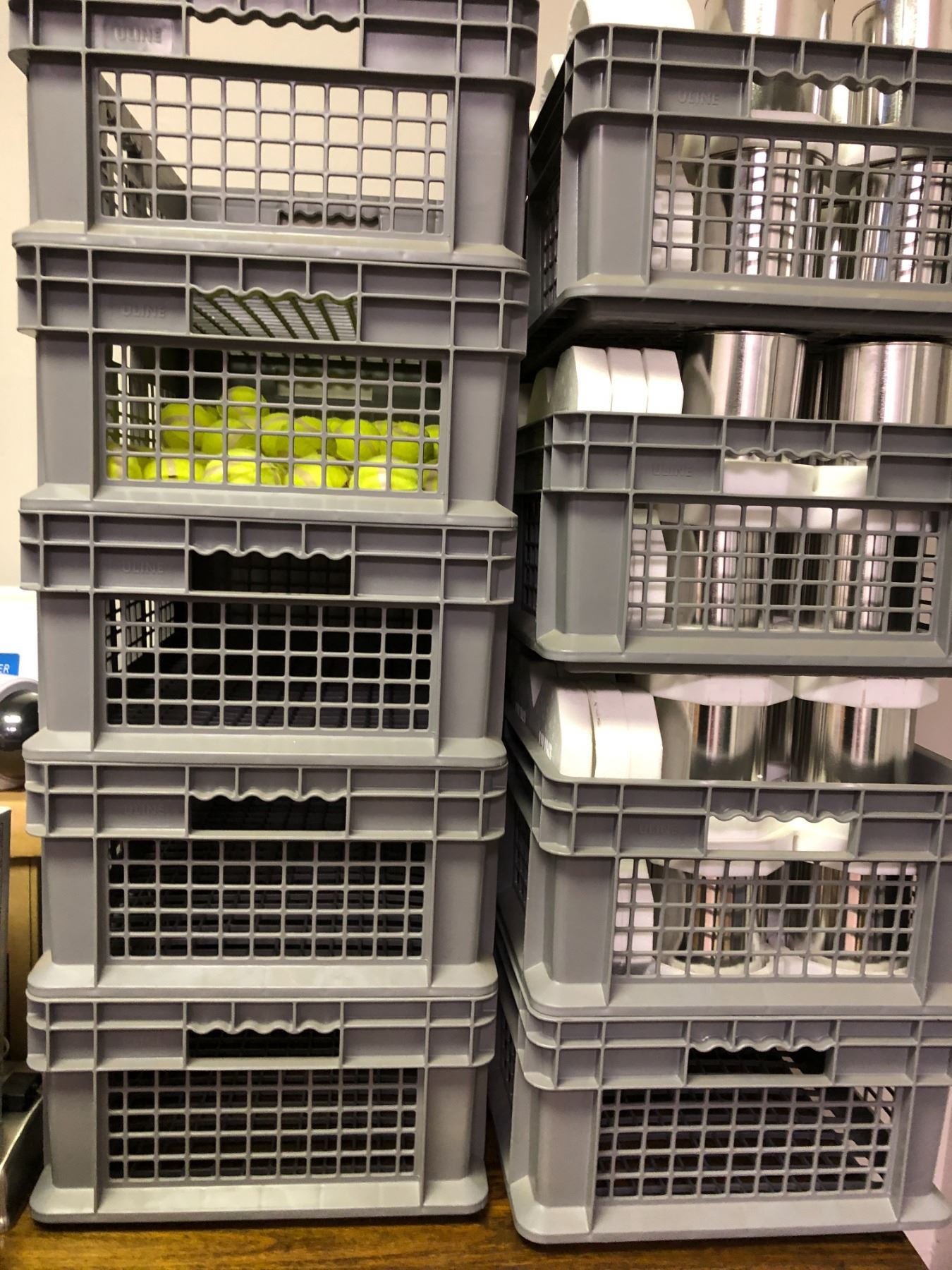 9 Plastic Totes with prop Cans and tennis balls