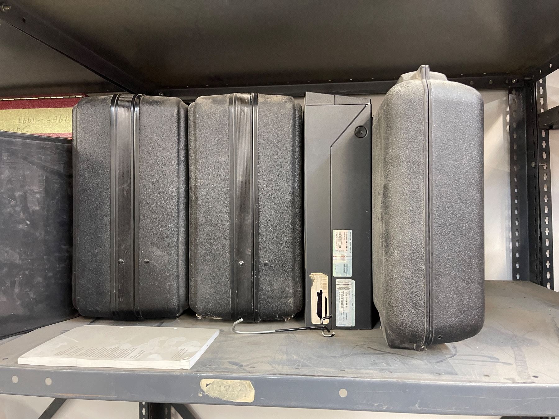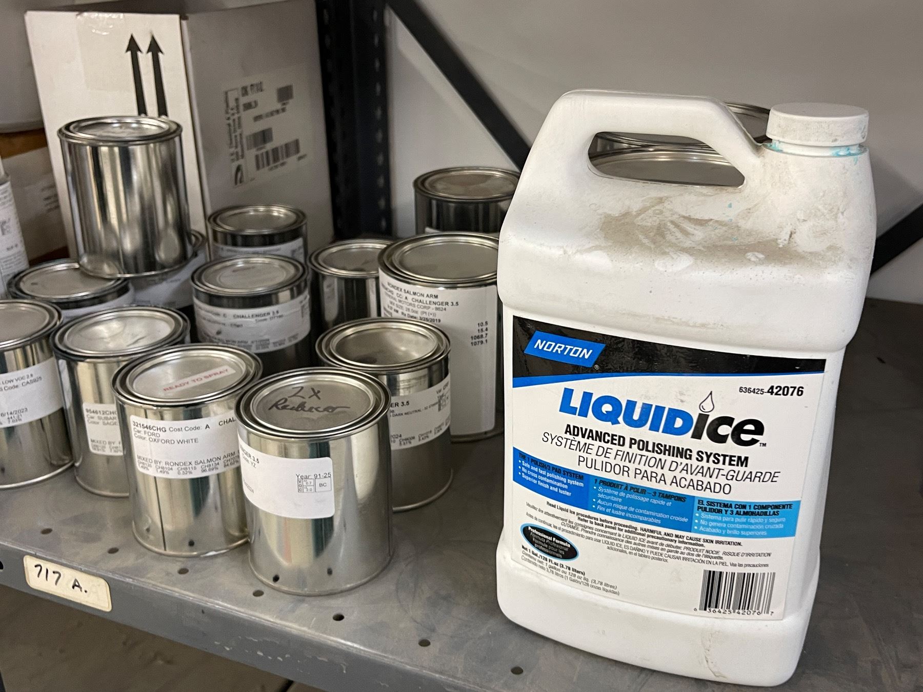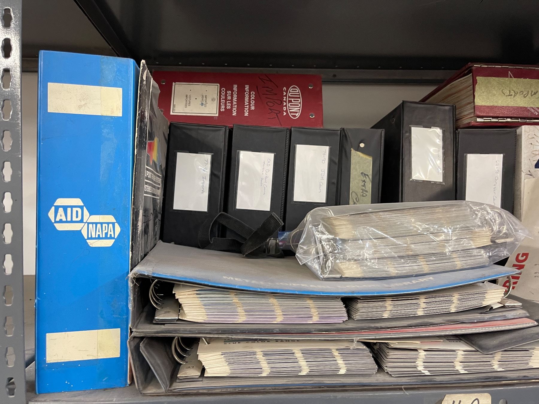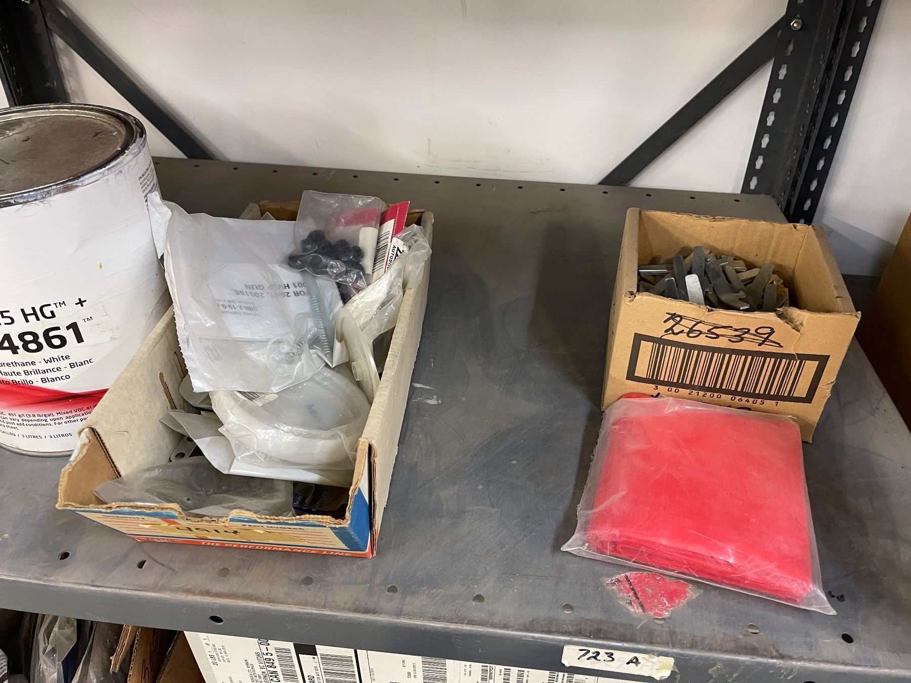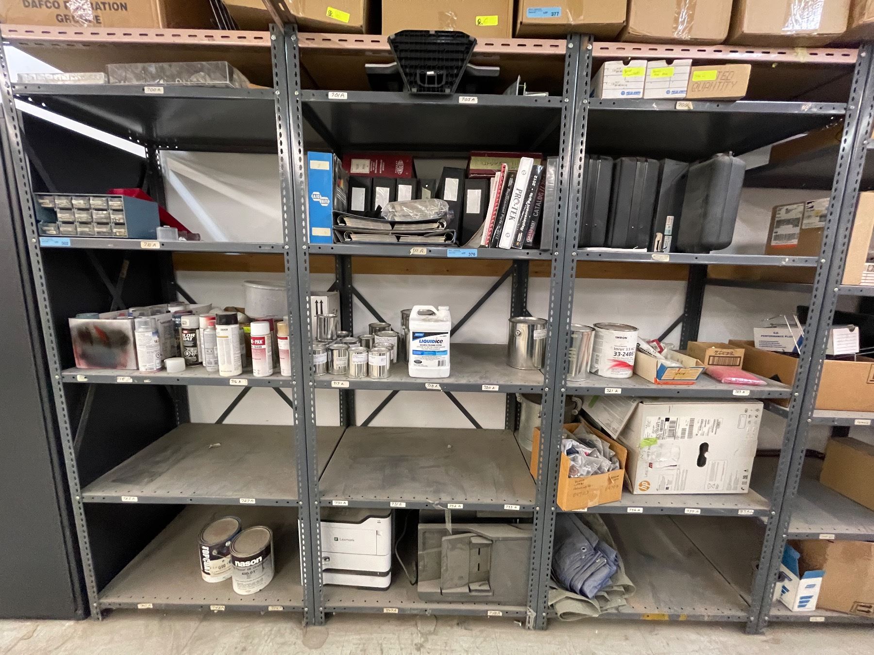 9 - Shelf lots of assorted paints, tarps, Thinners, printers, Cases, Manuals