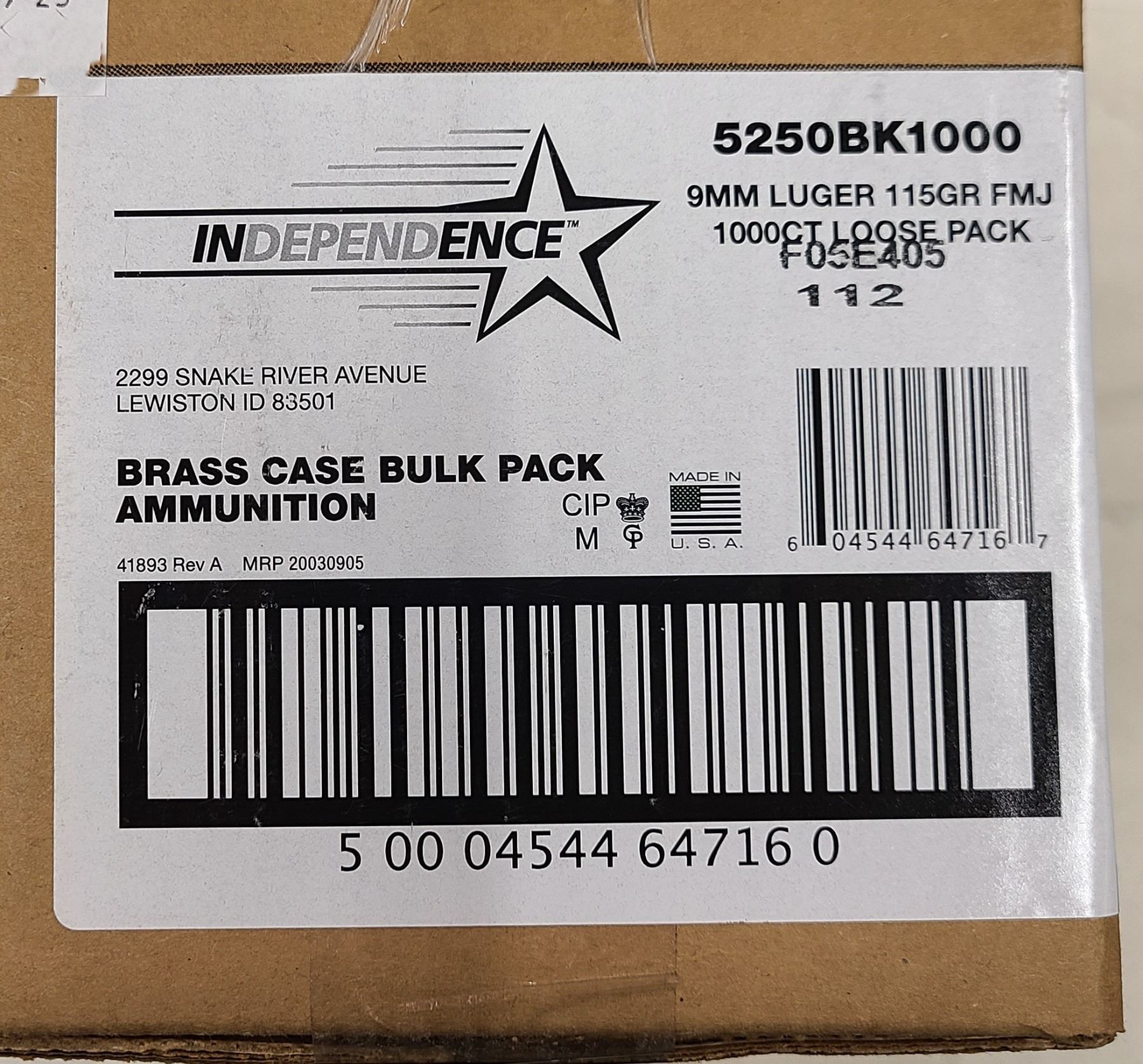 9 mm Luger BULK 1000 Rd Independance 115 gr RN by Federal
