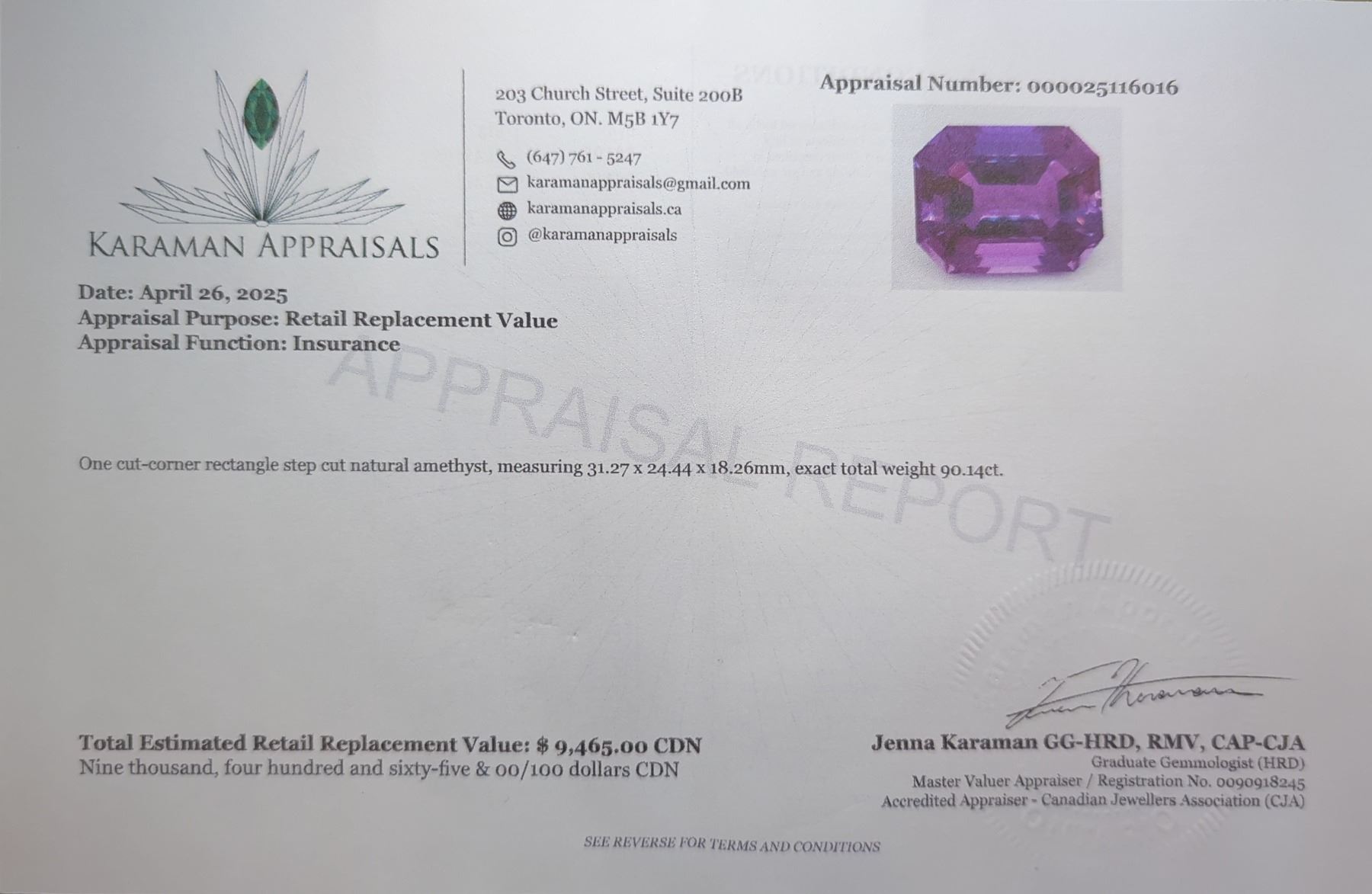 90.14 ct Certified Amethyst gemstone ($9,465 Appraisal)