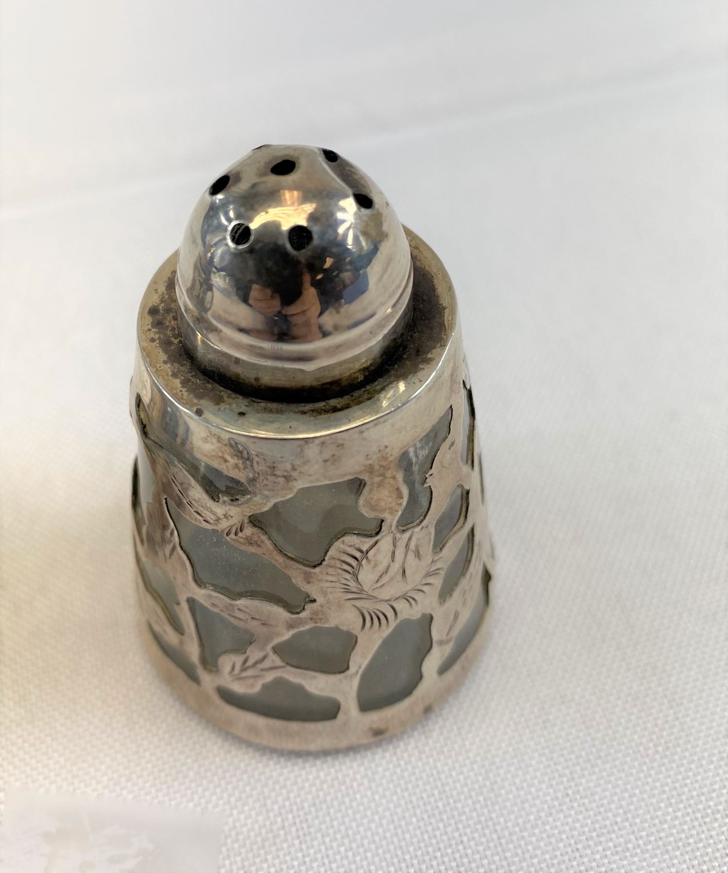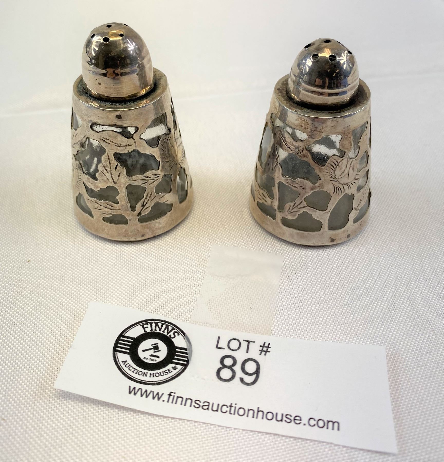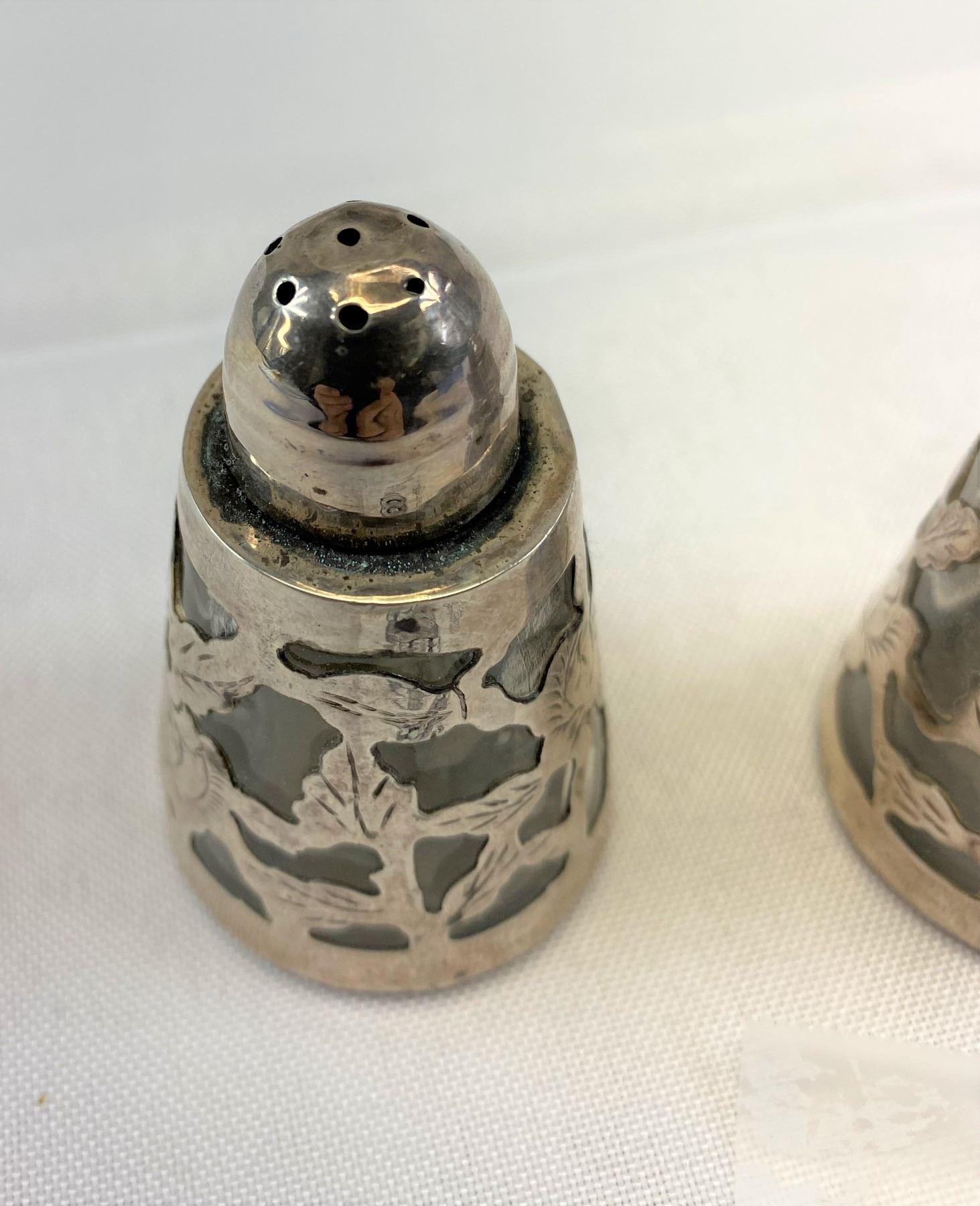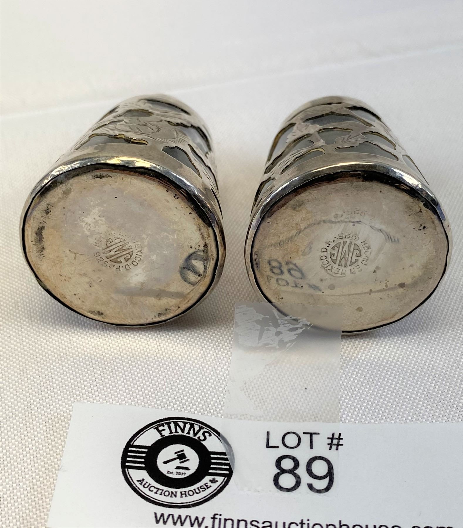 .925 Mexico Sterling Silver Overlay Glass Salt And Pepper Shakers, Etched Floral