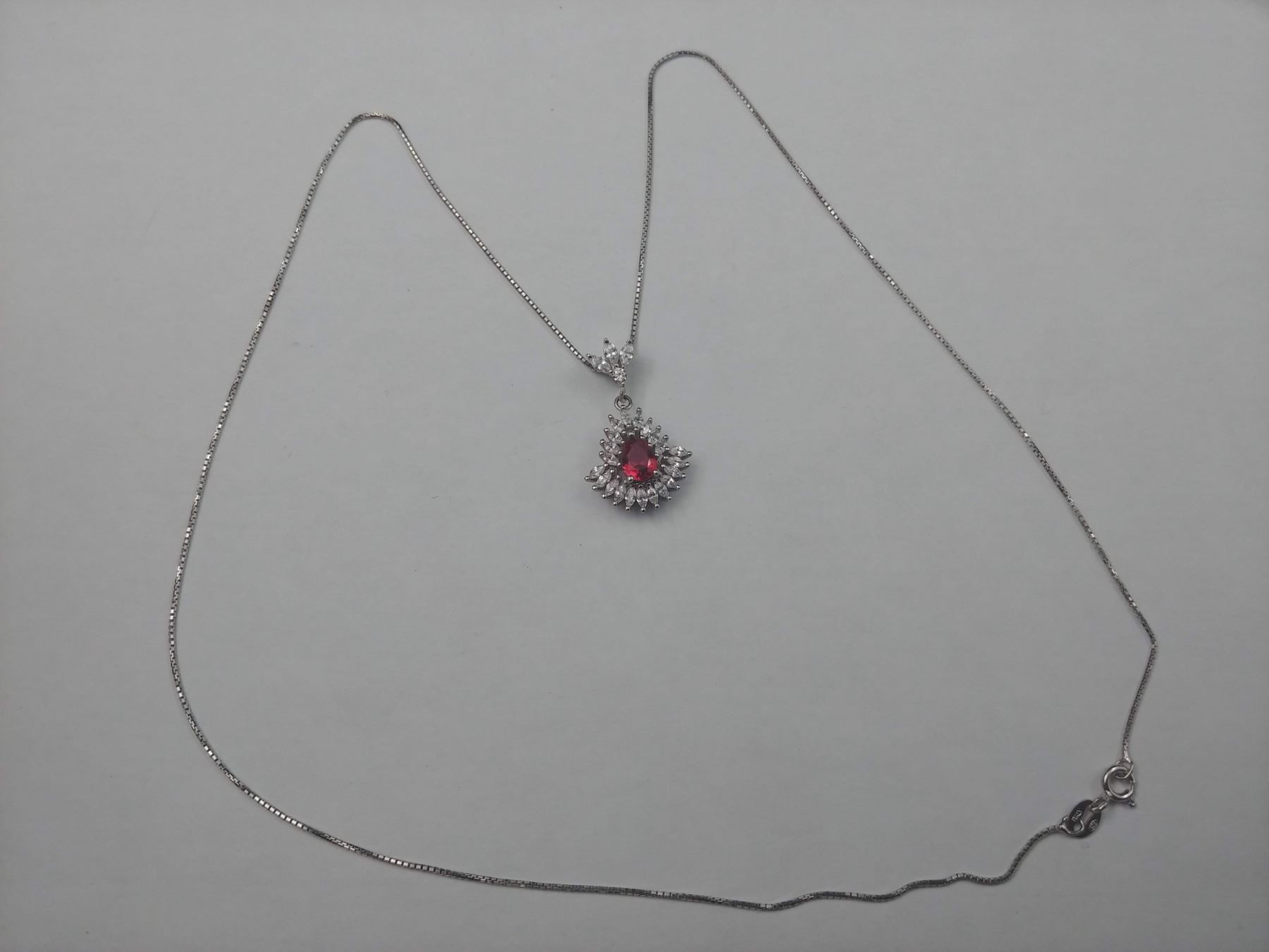 .925 STERLING SILVER NECKLACE WITH RED & WHITE GEM PENDANT