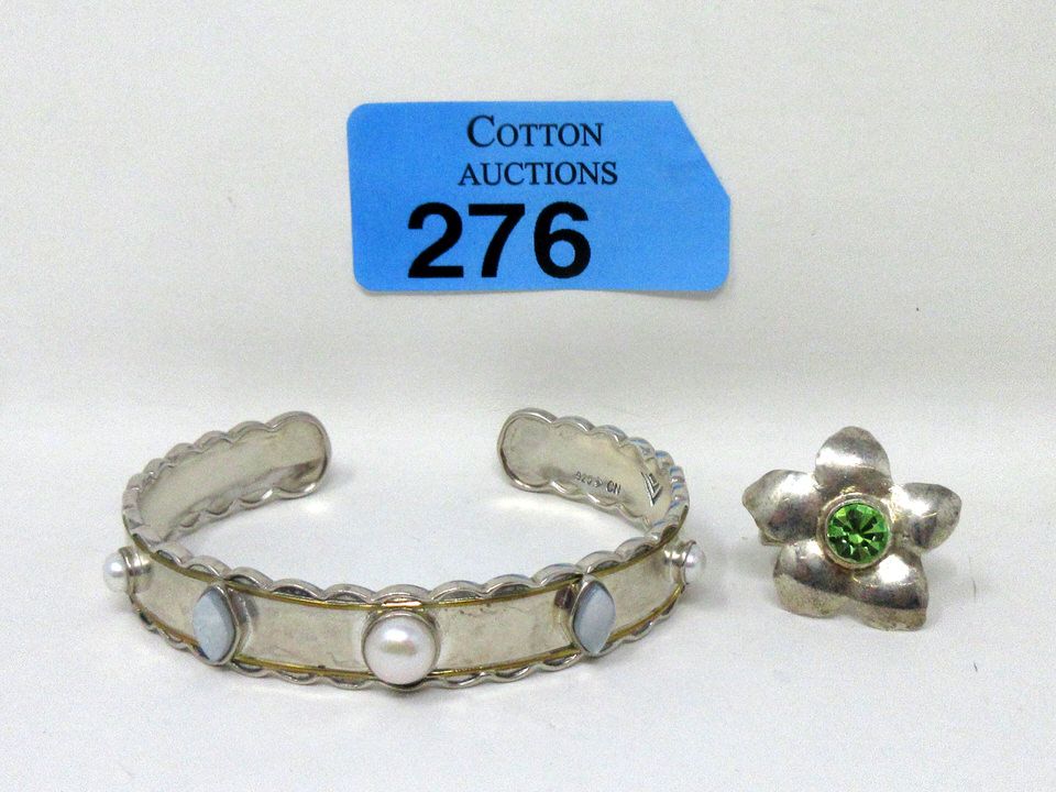 Cuff bracelet with pear & MOP is stamped .925 and has impressed hallmark. .950 Flower ring is adjustable and has a 24 mm diameter face.